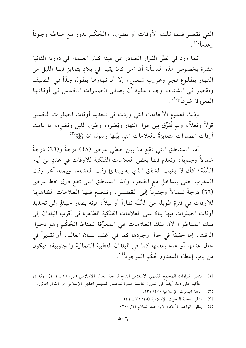 أما المناطق التي تقع مابين خطي عرض (٤٨) درجةً و (٦٦) درجةً شمالاً وجنوبًا، وتعدم فيها بعض العلامات الفلكية للأوقات في عددٍ من أيام السَّنَة، كأن لا يغيب الشفق الذي به يبتدئ وقت العشاء ,ويمتد آخر وقت المغرب حتى يتداخل مع الفجر, وكذا المناطق التي تقع فوق خط عرض (٦٦) درجةً شمالاً وجنوبًا إلى القطبين، وتنعدم فيها العلامات الظاهرية للأوقات في فترةٍ طويلة من السَّنَة نهارًا أو ليلاً , فإنه يُصار حينئذٍ إلى تحديد أوقات الصلوات فيها بناءً على العلامات الفلكية الظاهرة في أقرب البلدان إلى تلك المناطق؛ لأن تلك العلامات هي المعرِّفة لمناط الحُكْم وهو دخول الوقت , إما حقيقةً في حال وجودها كما في أغلب بلدان العالم, أو تقديراً في حال عدمها أو عدم بعضها كما في البلدان القطبية الشمالية والجنوبية, فيكون من باب إعطاء المعدوم حُكْم الموجود (٤).