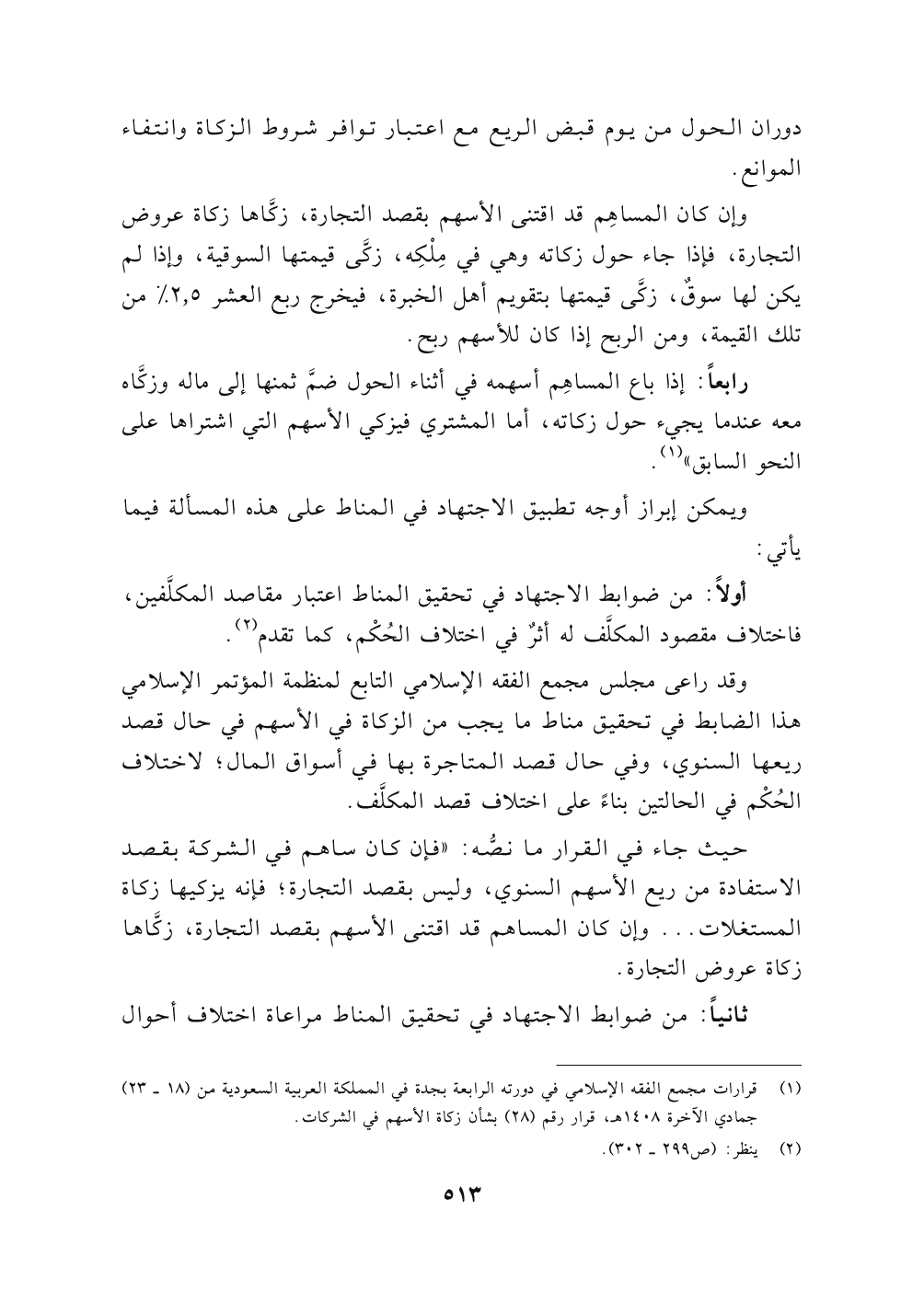 وقد راعى مجلس مجمع الفقه الإسلامي التابع لمنظمة المؤتمر الإسلامي هذا الضابط في تحقيق مناط مايجب من الزكاة في الأسهم في حال قصد ريعها السنوي, وفي حال قصد المتاجرة بها في أسواق المال؛ لاختلاف الحُكْم في الحالتين بناءً على اختلاف قصد المكلَّف.