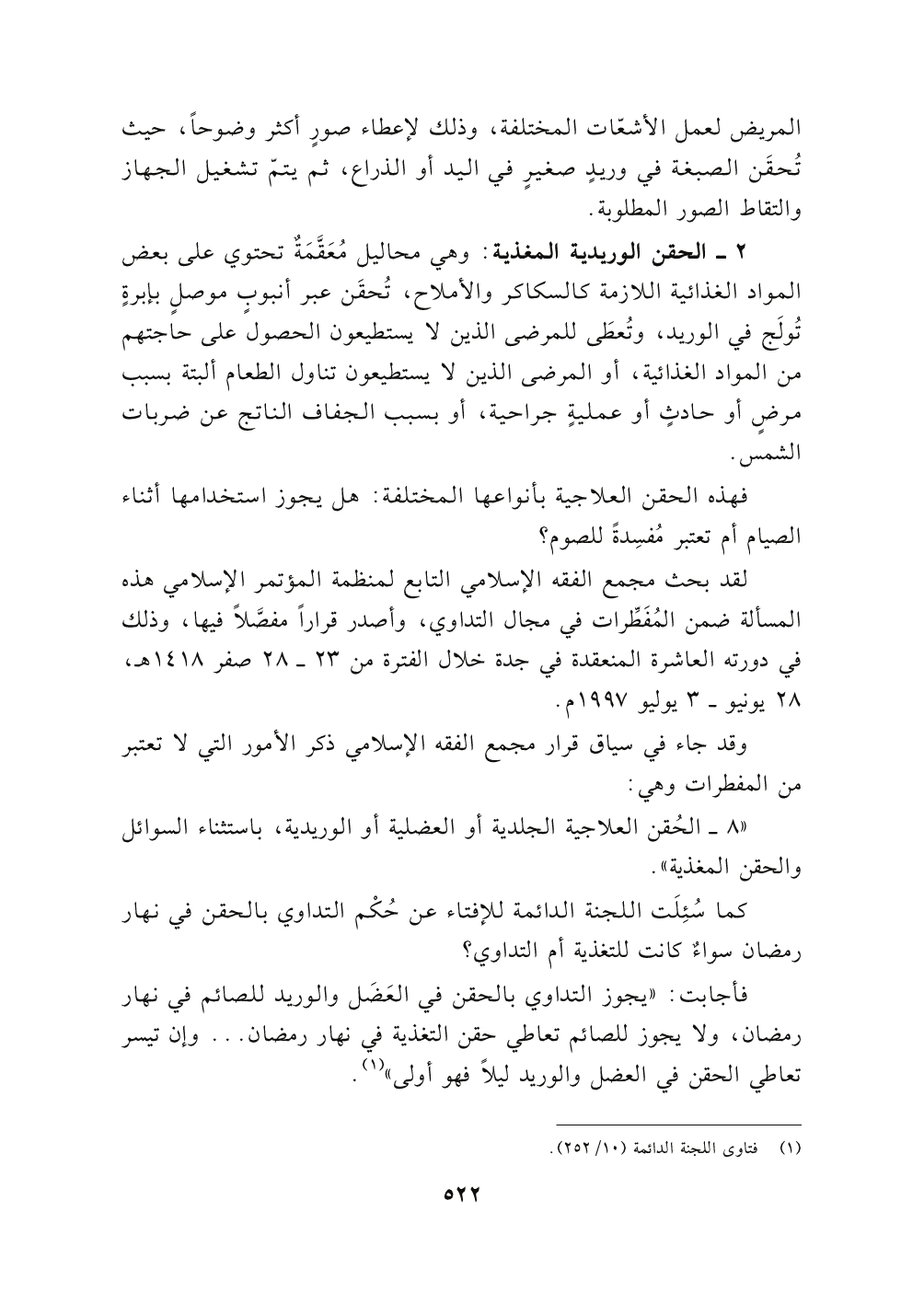 فأجابت: "يجوز التداوي بالحقن في العَضَل والوريد للصائم في نهار رمضان، ولا يجور للصائم تعاطي حقن التغذية في نهار رمضان. . . وإن تيسر تعاطي الحقن في العضل والوريد ليلاً فهو أولى" (١).
