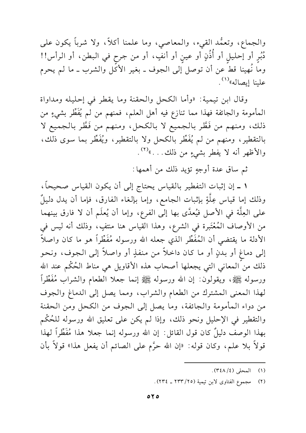 ١ - إن إثبات التفطير بالقياس يحتاج إلى أن يكون القياس صحيحاً , وذلك إما قياس عِلَّةٍ بإثبات الجامع , وإما بإلغاء الفارق , فإما أن يدل دليلٌ على العِلَّة في الأصل فيُعدَّى بها إلى الفرع , وإما أن يُعلَم أن لا فارق بينهما من الأوصاف المُعْتَبرة في الشرع , وهذا القياس هنا منتفٍ, وذلك أنه ليس في الأدلة ما يقتضي أن المُفَطِّر الذي جعله الله ورسوله مُفَطِّراً هو ما كان واصلاً إلى دماغٍ أو بدنٍ أو ما كان داخلاً من منفذٍ أو واصلاً إلى الجوف, ونحو ذلك من المعاني التي يجعلها أصحاب هذه الأقاويل هي مناط الحُكْم عند الله ورسوله صلى الله عليه وسلم , ويقولون إن الله ورسوله صلى الله عليه وسلم إنما جعلا الطعام والشراب مُفَطِّراً لهذا المعنى المشترك من الطعام والشراب , ومما يصل إلى الدماغ والجوف من دواء المأمومة والجائفة , وما يصل إلى الجوف من الكحل ومن الحقنة والتقطير في الإحليل ونحو ذلك, وإذا لم يكن على تعليق الله ورسوله للحُكْم بهذا الوصف دليلٌ كان قول القائل: إن الله ورسوله إنما جعلا هذا مُفَطِّراً لهذا قولاً بلا علم , وكان قوله: " إن الله حرَّم على الصائم أن يفعل هذا " قولاً بأن