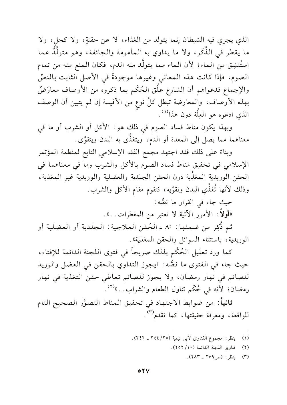 وبناءً على ذلك فقد اجتهد مجمع الفقه الإسلامي التابع لمنظمة المؤتمر الإسلامي في تحقيق مناط فساد الصوم بالأكل والشرب ومافي معناهما في الحقن الوريدية المغذِّية دون الحقن الجلدية والعضلية والوريدية غير المغذية, وذلك لأنها تُغذِّي البدن وتقوِّيه , فتقوم مقام الأكل والشرب.