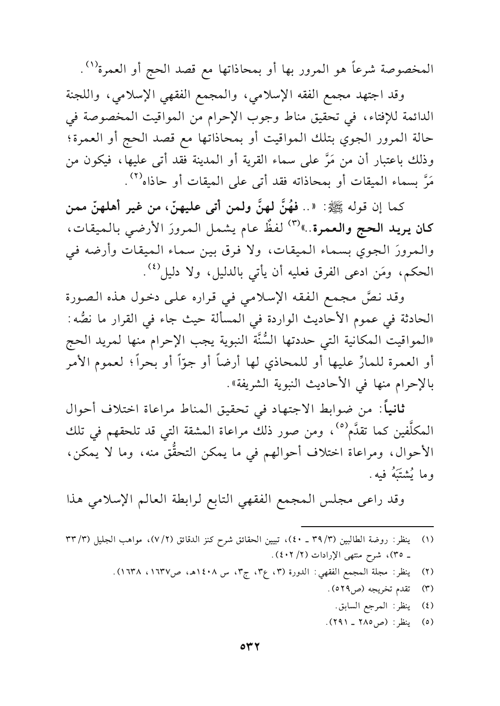 كما إن قوله صلى الله عليه وسلم: " .. فهُنَّ لهنَّ ولمن أتى عليهنّ، من غير أهلهنّ ممن كان يريد الحج والعمرة .. " (٣) لفظٌ عام يشمل المرورَ الأرضي بالميقات, والمرورَ الجوي بسماء الميقات , ولافرق بين سماء الميقات وأرضه في الحكم، ومَن ادعى الفرق فعليه أن يأتي بالدليل، ولا دليل (٤).