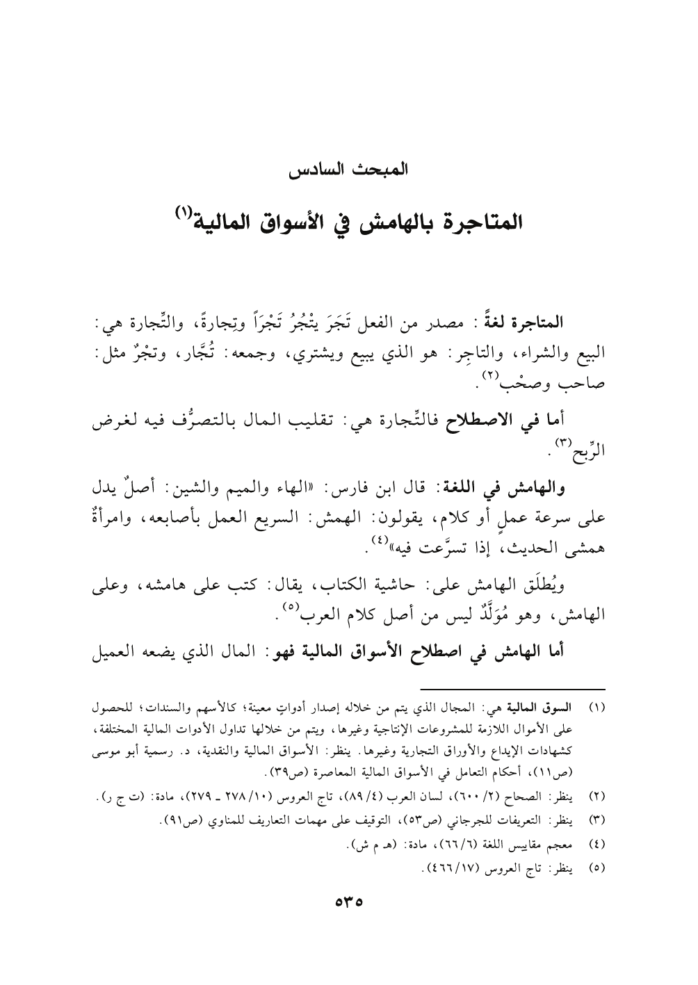 أما الهامش في اصطلاح الأسواق المالية فهو: المال الذي يضعه العميل
