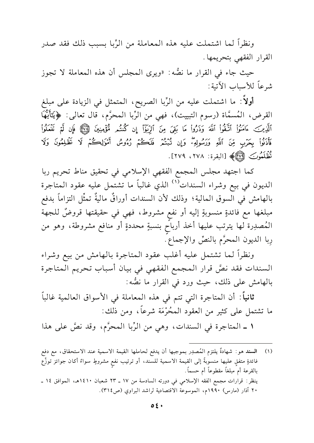 كما اجتهد مجلس المجمع الفقهي الإسلامي في تحقيق مناط تحريم ربا الديون في بيع وشراء السندات (١) الذي غالباً ما تشتمل عليه عقود المتاجرة بالهامش في السوق المالية؛ وذلك لأن السندات أوراقٌ ماليةٌ تمثِّل التزاماً بدفع مبلغها مع فائدةٍ منسوبةٍ إليه أو نفعٍ مشروط , فهي في حقيقتها قروضٌ للجهة المُصدِرة لها يترتب عليها أخذ أرباحٍ بنسبةٍ محددةٍ أو منافع مشروطة , وهو من رِبا الديون المحرَّم بالنصِّ والإجماع.