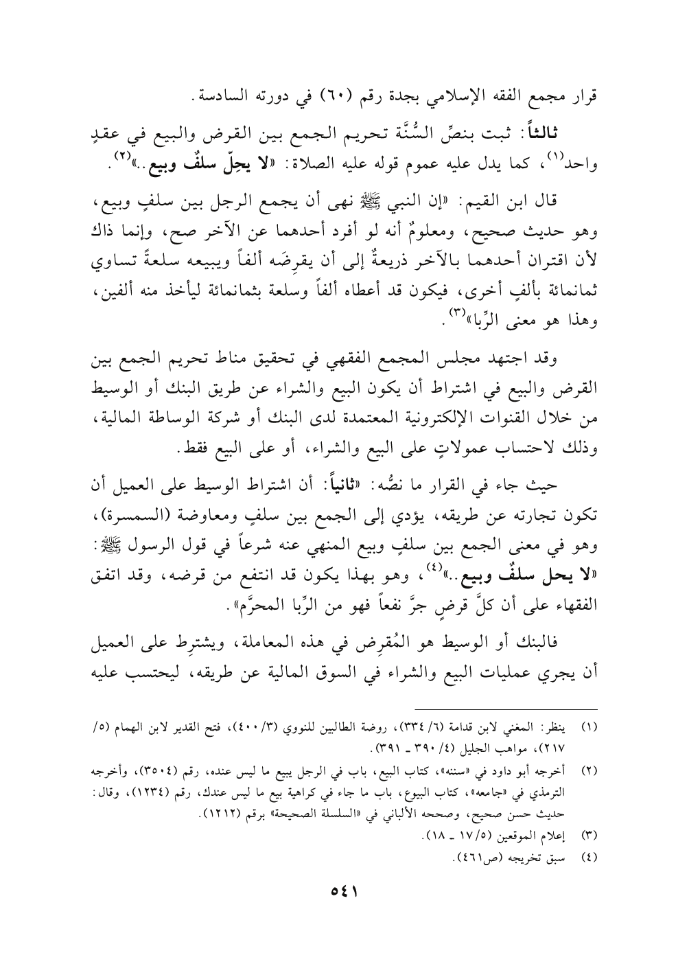 ثالثاً: ثبت بنصِّ السُّنَّة تحريم الجمع بين القرض والبيع في عقدٍ واحد (١) , كما يدل عليه عموم قوله عليه الصلاة: "لا يحِلّ سلفٌ وبيع .. (٢) "