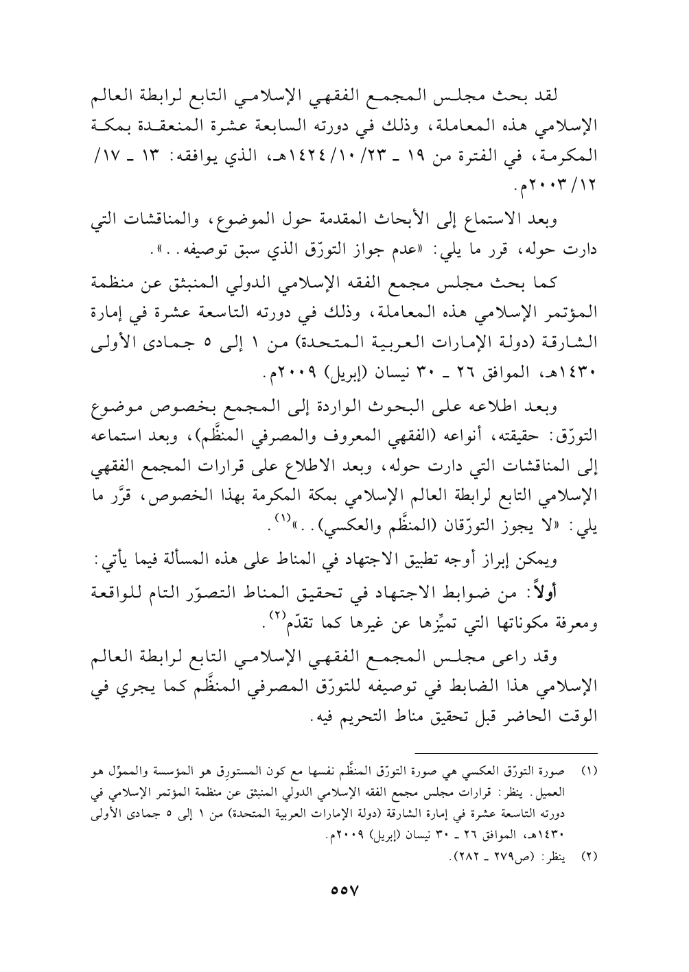 وبعد اطلاعه على البحوث الواردة إلى المجمع بخصوص موضوع التورّق: حقيقته، أنواعه (الفقهي المعروف والمصرفي المنظَّم)، وبعد استماعه إلى المناقشات التي دارت حوله، وبعد الاطلاع على قرارات المجمع الفقهي الإسلامي التابع لرابطة العالم الإسلامي بمكة المكرمة بهذا الخصوص, قرَّر مايلي: " لا يجوز التورّقان (المنظَّم والعكسي) .. " (١).