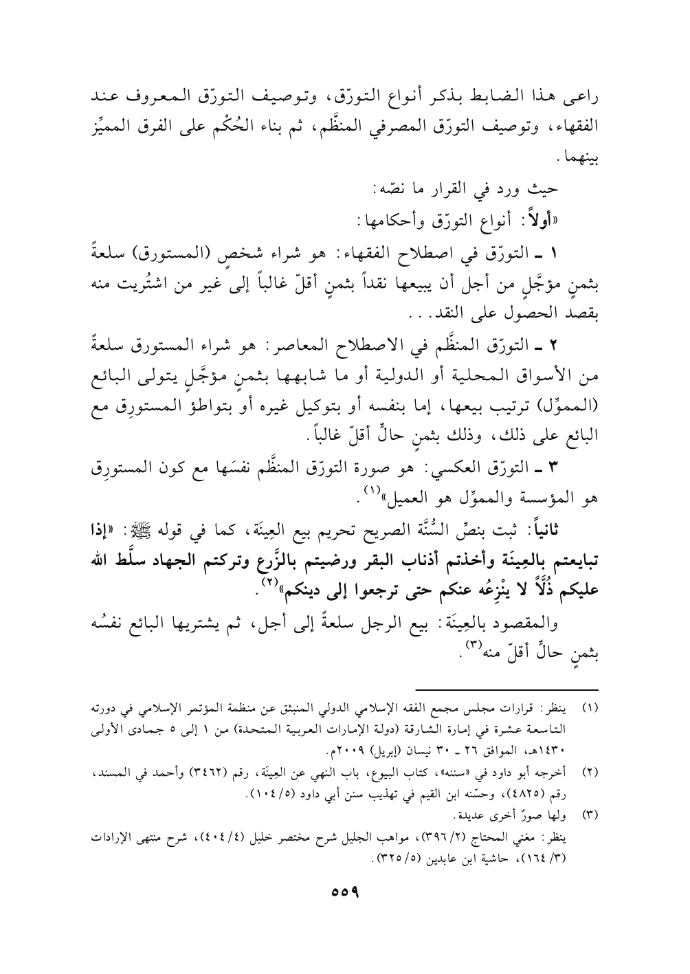 حيث ورد في القرار ما نصّه: " أولاً: أنواع التورّق وأحكامها: