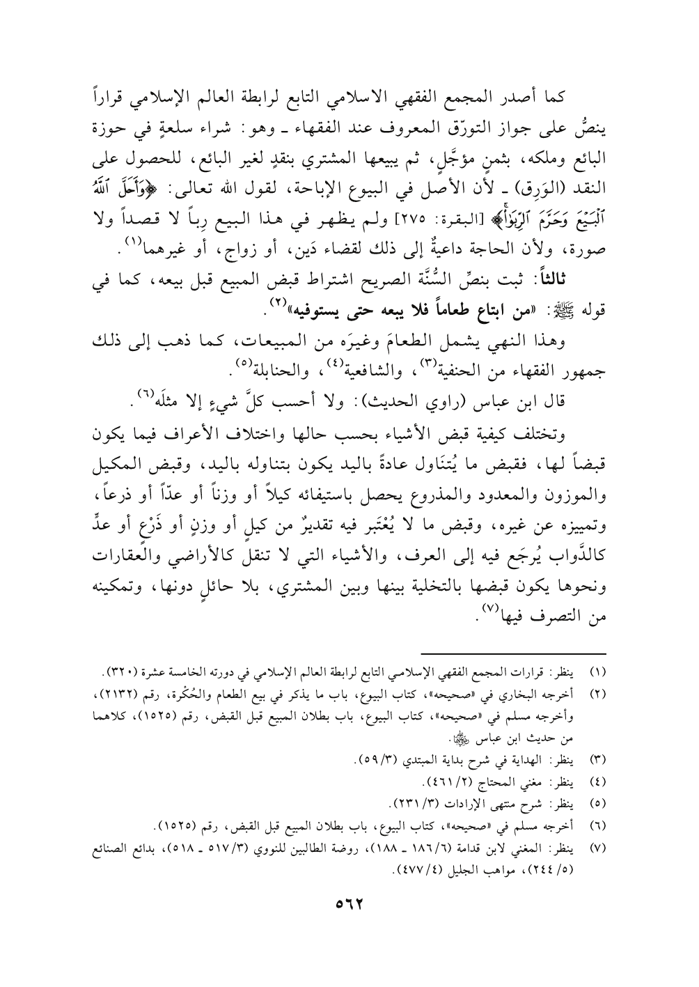 (٢) أخرجه البخاري في "صحيحه", كتاب البيوع, باب مايذكر في بيع الطعام والحُكْرة, رقم (٢١٣٢) , وأخرجه مسلم في "صحيحه",كتاب البيوع, باب بطلان المبيع قبل القبض, رقم (١٥٢٥) , كلاهما من حديث ابن عباس رضي الله عنهما.