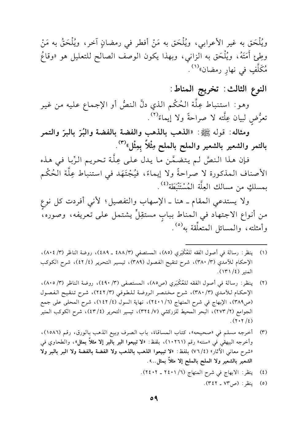 فإن هذا النصَّ لم يتضمَّن ما يدل على عِلَّة تحريم الرِّبا في هذه الأصناف المذكورة لا صراحةً ولا إيماءً، فيُجْتَهَد في استنباط عِلَّة الحُكْم بمسلكٍ من مسالك العِلَّة المُسْتَنْبَطَة (٤).