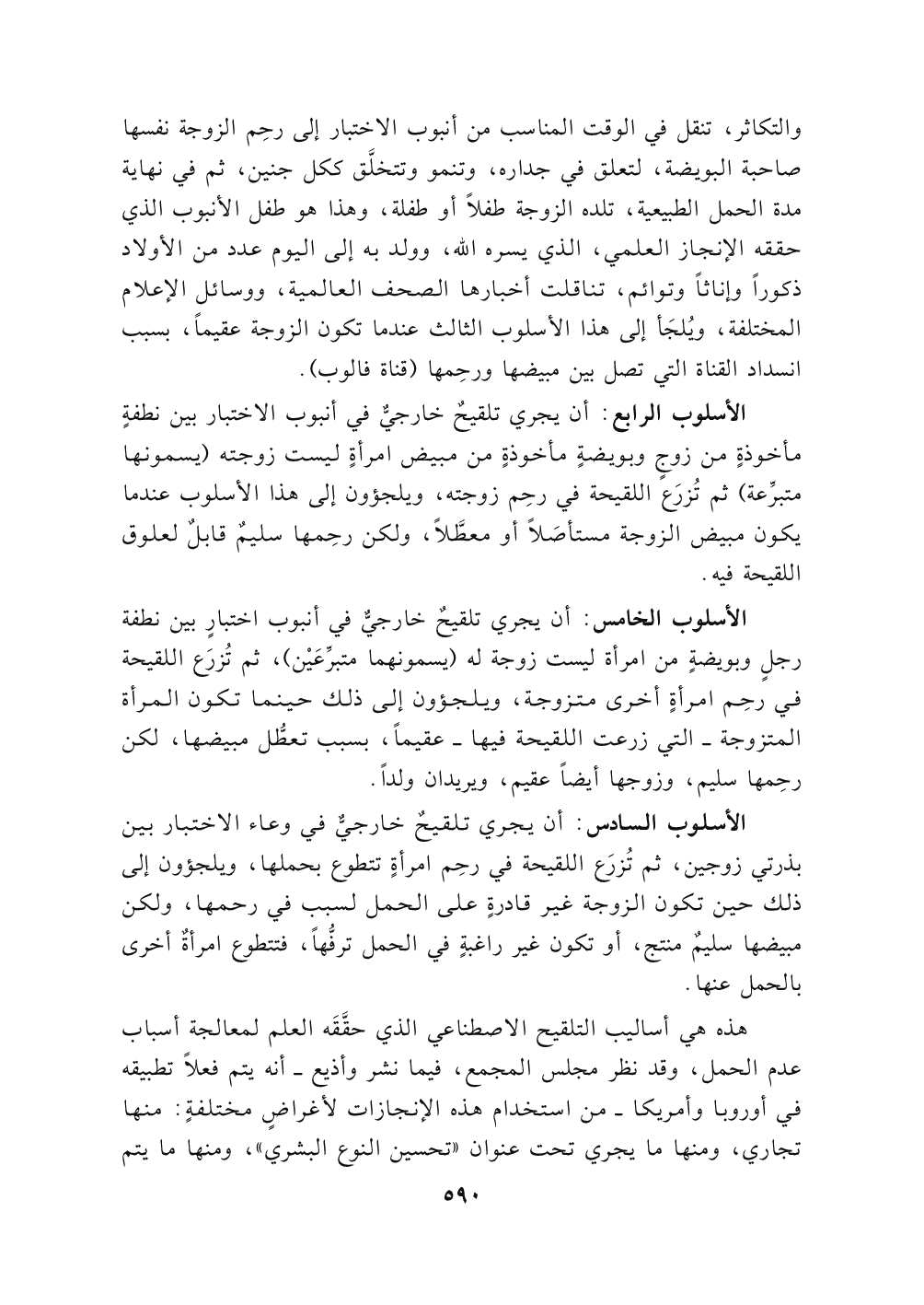 هذه هي أساليب التلقيح الاصطناعي الذي حقَّقَّه العلم لمعالجة أسباب عدم الحمل , وقد نظر مجلس المجمع، فيما نشر وأذيع- أنه يتم فعلاً تطبيقه في أوربا وأمريكا- من استخدام هذه الإنجازات لأغراضٍ مختلفةٍ: منها تجاري، ومنها ما يجري تحت عنوان (تحسين النوع البشري)، ومنها ما يتم