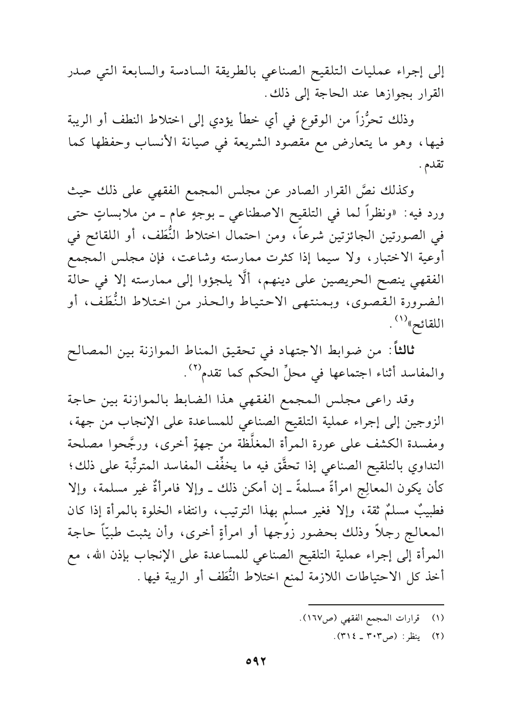 وكذلك نصَّ القرار الصادر عن مجلس المجمع الفقهي على ذلك حيث ورد فيه: " ونظرًا لما في التلقيح الاصطناعي- بوجهٍ عام-من ملابساتٍ حتى في الصورتين الجائزتين شرعًا، ومن احتمال اختلاط النُّطَف، أو اللقائح في أوعية الاختبار، ولاسيما إذا كثرت ممارسته وشاعت، فإن مجلس المجمع الفقهي ينصح الحريصين على دينهم، ألاَّ يلجؤوا إلى ممارسته إلا في حالة الضرورة القصوى، وبمنتهى الاحتياط والحذر من اختلاط النُّطَف، أو اللقائح" (١).