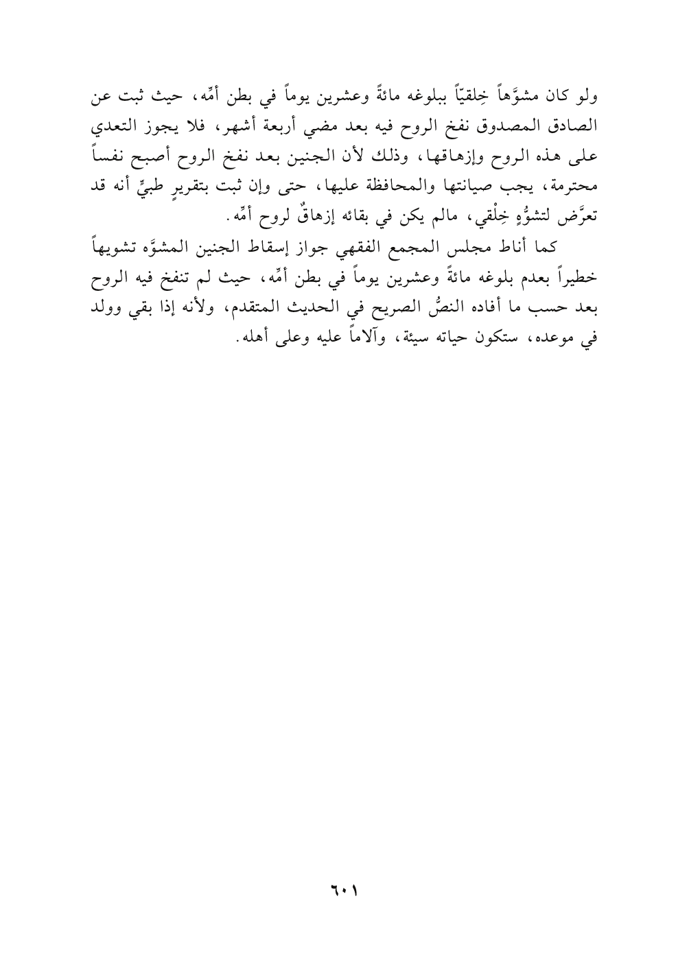 ولو كان مشوَّهاً خِلقياً ببلوغه مائةً وعشرين يوماً في بطن أمِّه , حيث ثبت عن الصادق المصدوق نفخ الروح فيه بعد مضي أربعة أشهر , فلايجوز التعدي على هذه الروح وإزهاقها, وذلك لأن الجنين بعد نفخ الروح أصبح نفسًا محترمة، يجب صيانتها والمحافظة عليها , حتى وإن ثبت بتقريرٍ طبيٍّ أنه قد تعرَّض لتشوُّهٍ خِلْقي, مالم يكن في بقائه إزهاقٌ لروح أمِّه.