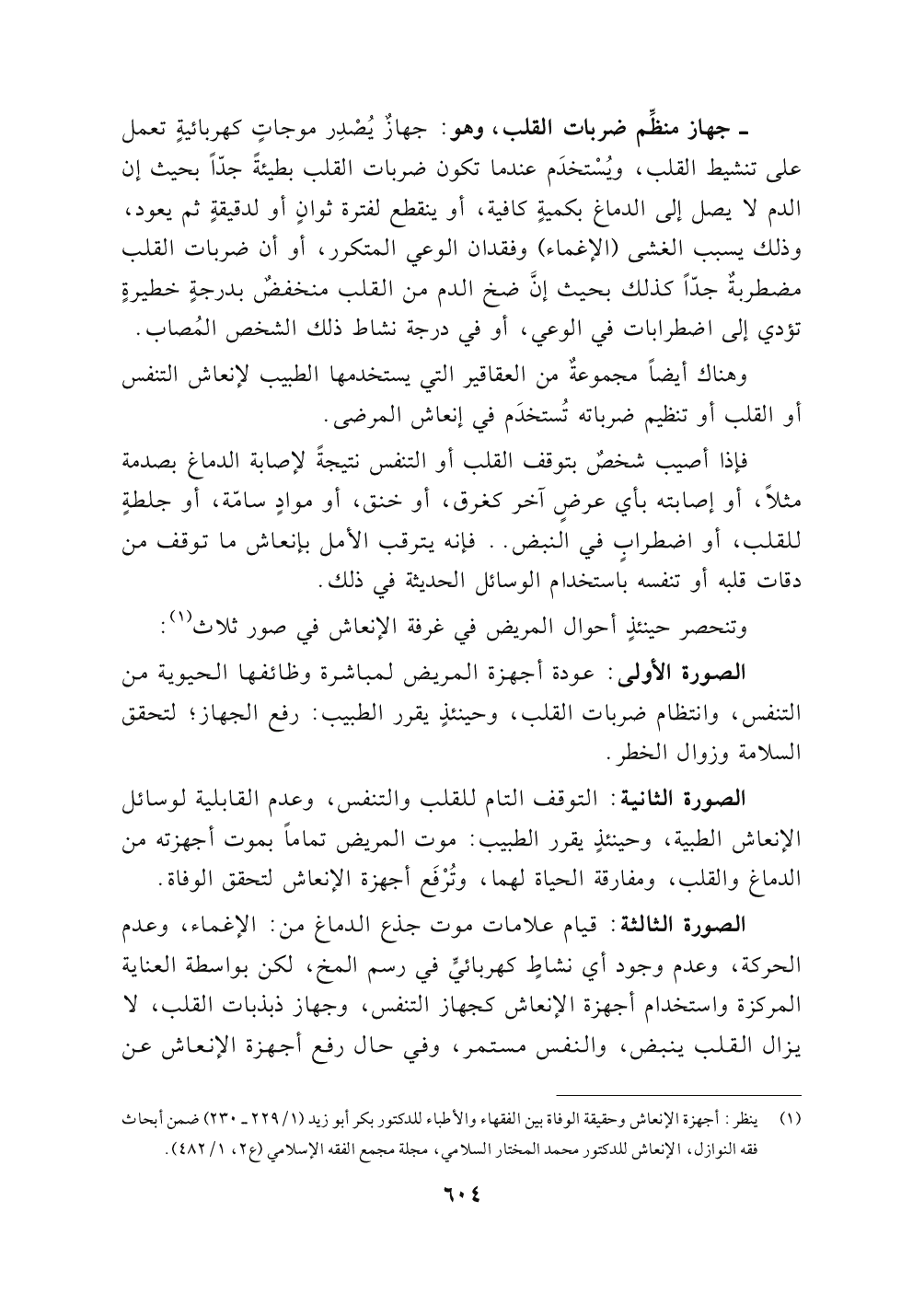 (١) ينظر: أجهزة الإنعاش وحقيقة الوفاة بين الفقهاء والأطباء للدكتور بكر أبوزيد (١/ ٢٢٩ - ٢٣٠) ضمن أبحاث فقه النوازل , الإنعاش للدكتور محمد المختار السلامي, مجلة مجمع الفقه الإسلامي, ع ٢, ١/ ٤٨٢.