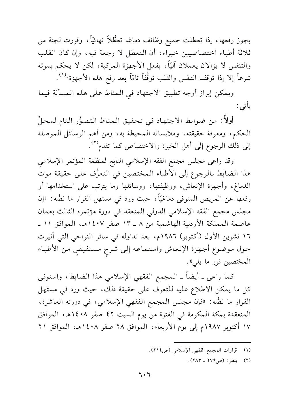 وقد راعى مجلس مجمع الفقه الإسلامي التابع لمنظمة المؤتمر الإسلامي هذا الضابط بالرجوع إلى الأطباء المختصين في التعرُّف على حقيقة موت الدماغ، وأجهزة الإنعاش، ووظيفتها، ووسائلها وما يترتب على استخدامها أو رفعها عن المريض المتوفى دماغياً , حيث ورد في مستهل القرار ما نصُّه: " إن مجلس مجمع الفقه الإسلامي الدولي المنعقد في دورة مؤتمره الثالث بعمان عاصمة المملكة الأردنية الهاشمية من ٨ - ١٣ صفر ١٤٠٧ هـ، الموافق ١١ - ١٦ تشرين الأول ... (أكتوبر) ١٩٨٦ م، بعد تداوله في سائر النواحي التي أثيرت حول موضوع أجهزة الإنعاش واستماعه إلى شرحٍ مستفيضٍ من الأطباء المختصين قرر مايلي".