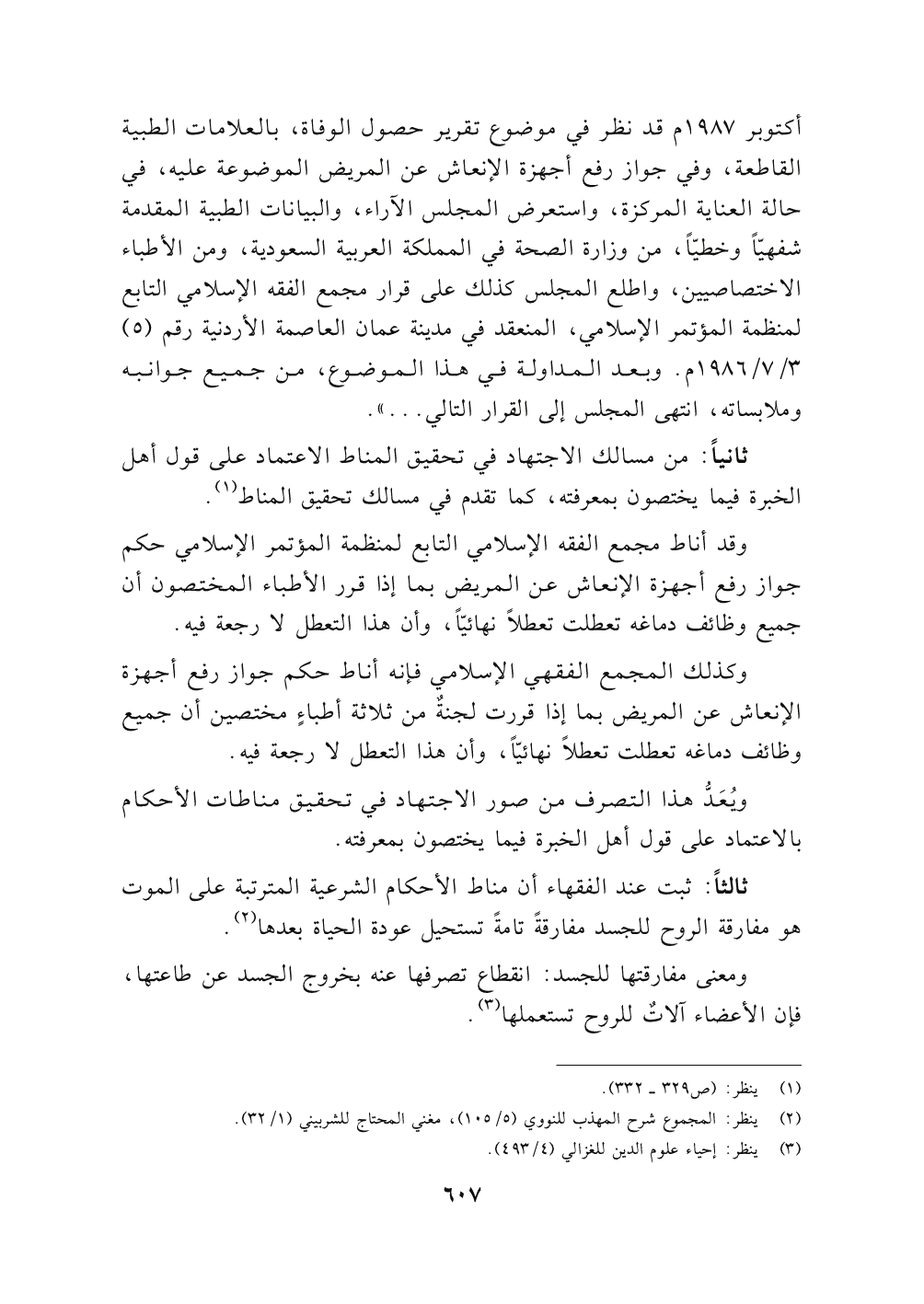 أكتوبر ١٩٨٧ م قد نظر في موضوع تقرير حصول الوفاة، بالعلامات الطبية القاطعة، وفي جواز رفع أجهزة الإنعاش عن المريض الموضوعة عليه، في حالة العناية المركزة، واستعرض المجلس الآراء، والبيانات الطبية المقدمة شفهيًّا وخطيًّا، من وزارة الصحة في المملكة العربية السعودية، ومن الأطباء الاختصاصيين، واطلع المجلس كذلك على قرار مجمع الفقه الإسلامي التابع لمنظمة المؤتمر الإسلامي، المنعقد في مدينة عمان العاصمة الأردنية رقم (٥) ٣/ ٧/١٩٨٦ م. وبعد المداولة في هذا الموضوع، من جميع جوانبه وملابساته، انتهى المجلس إلى القرار التالي ... ".