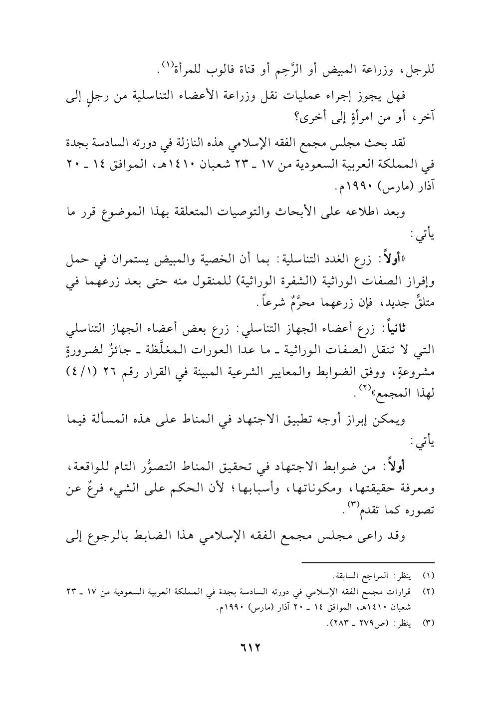 (٢) قرارات مجمع الفقه الإسلامي في دورته السادسة بجدة في المملكة العربية السعودية من ١٧ - ٢٣ شعبان ١٤١٠ هـ الموافق ١٤ - ٢٠ آذار (مارس) ١٩٩٠ م.