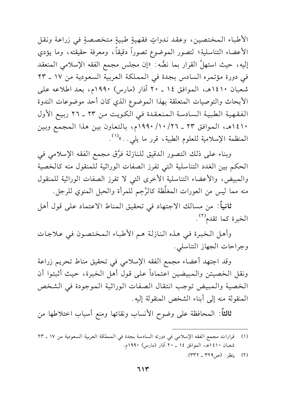 الأطباء المختصين، وعقد ندواتٍ فقهيةٍ طبيةٍ متخصصةٍ في زراعة ونقل الأعضاء التناسلية؛ لتصور الموضوع تصوراً دقيقاً, ومعرفة حقيقته , ومايؤدي إليه , حيث استهلَّ القرار بما نصُّه: " إن مجلس مجمع الفقه الإسلامي المنعقد في دورة مؤتمره السادس بجدة في المملكة العربية السعودية من ١٧ - ٢٣ شعبان ١٤١٠ هـ الموافق ١٤ - ٢٠ آذار (مارس) ١٩٩٠ م، بعد اطلاعه على الأبحاث والتوصيات المتعلقة بهذا الموضوع الذي كان أحد موضوعات الندوة الفقهية الطبية السادسة المنعقدة في الكويت من ٢٣ - ٢٦ ربيع الأول ١٤١٠ هـ الموافق ٢٣ - ٢٦/ ١٠/ ١٩٩٠ م، بالتعاون بين هذا المجمع وبين المنظمة الإسلامية للعلوم الطبية، قرر ما يلي .. " (١).