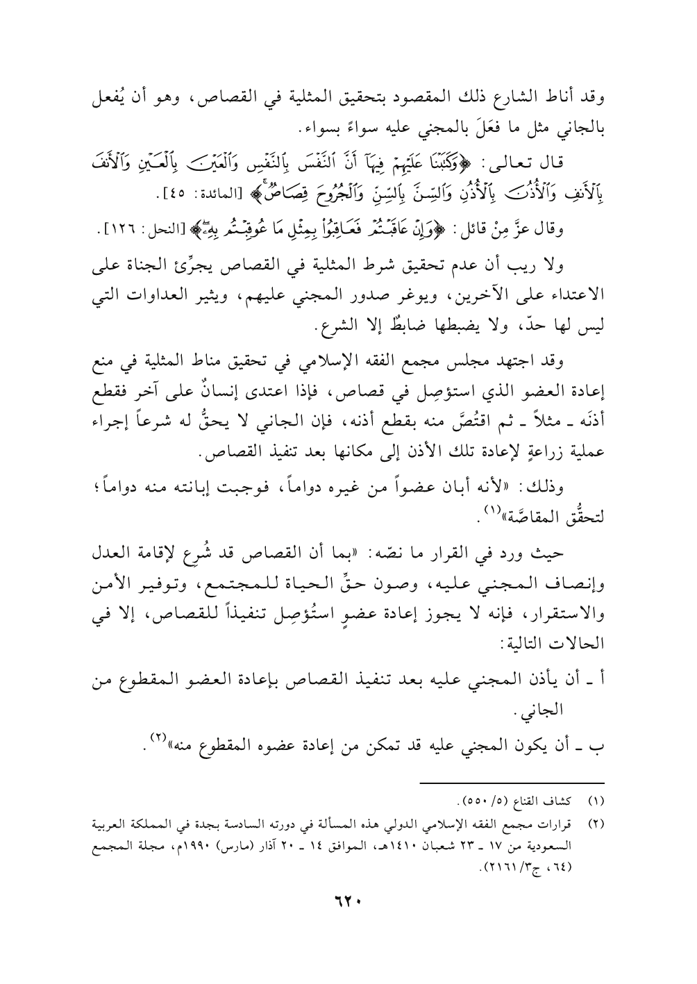 حيث ورد في القرار مانصّه: " بما أن القصاص قد شُرِع لإقامة العدل وإنصاف المجني عليه، وصون حقِّ الحياة للمجتمع، وتوفير الأمن والاستقرار، فإنه لا يجوز إعادة عضوٍ استُؤصِل تنفيذاً للقصاص، إلا في الحالات التالية: