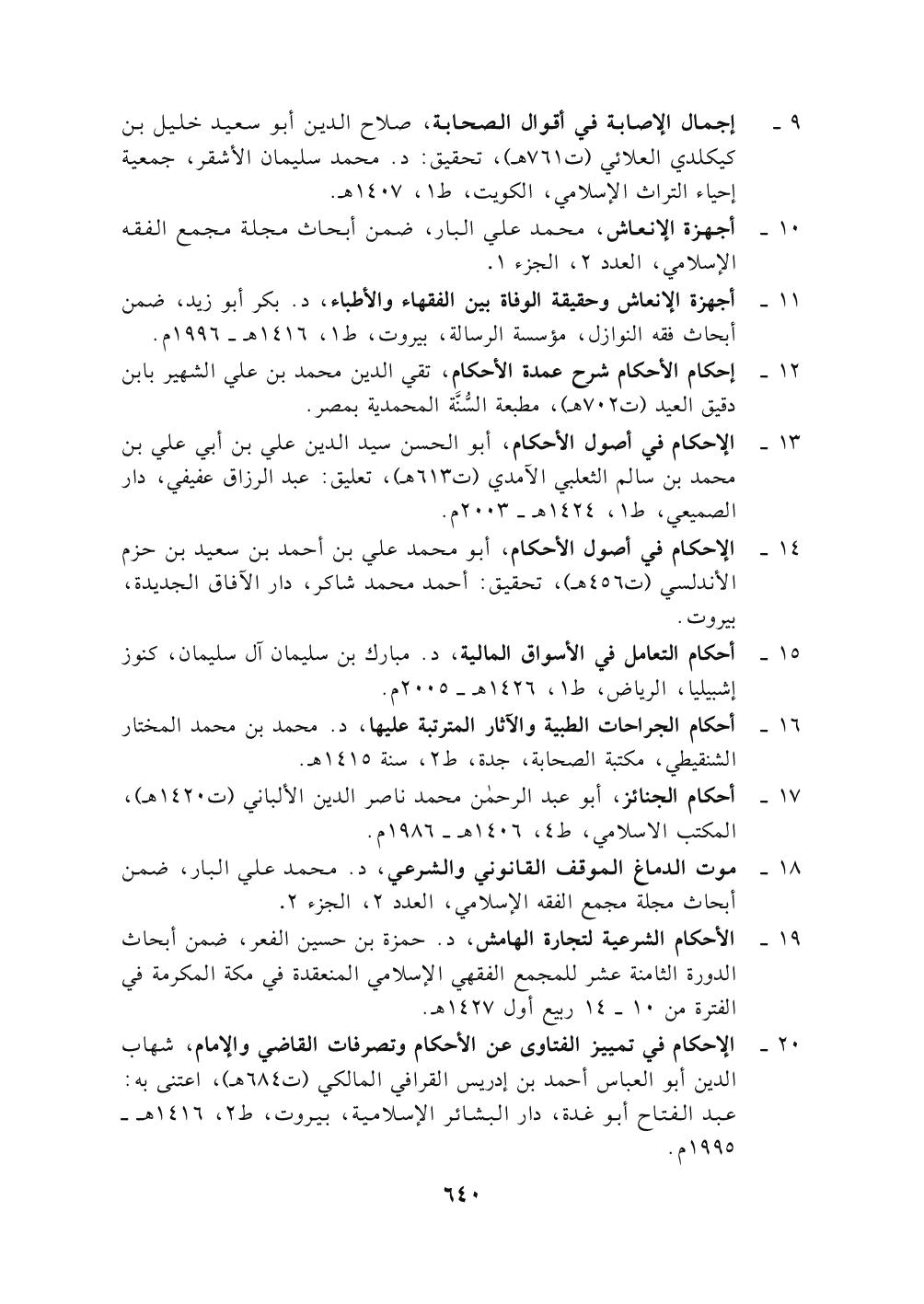 ٩. إجمال الإصابة في أقوال الصحابة , صلاح الدين أبو سعيد خليل بن كيكلدي العلائي (ت ٧٦١ هـ) , تحقيق: د. محمد سليمان الأشقر, جمعية إحياء التراث الإسلامي , الكويت, ط ١ , ١٤٠٧ هـ.