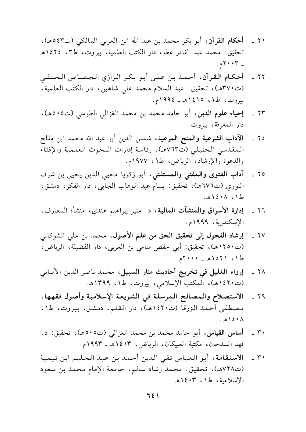 ٣٠. أساس القياس , أبو حامد محمد بن محمد الغزالي (ت ٥٠٥ هـ) , تحقيق: د. فهد السدحان ,مكتبة العبيكان ,الرياض, ١٤١٣ هـ -١٩٩٣ م.