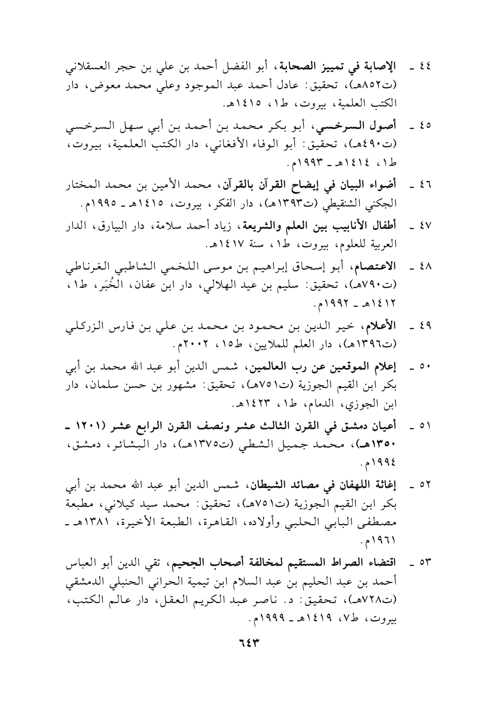 ٥٣. اقتضاء الصراط المستقيم لمخالفة أصحاب الجحيم, تقي الدين أبو العباس أحمد بن عبدالحليم بن عبدالسلام ابن تيمية الحراني الحنبلي الدمشقي (ت ٧٢٨ هـ) ,تحقيق: د. ناصر عبدالكريم العقل, دار عالم الكتب، بيروت، ط ٧, ١٤١٩ هـ - ١٩٩٩ م.