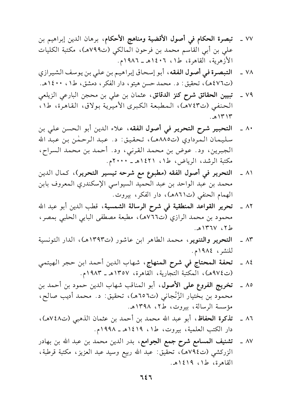 ٨٠. التحبير شرح التحرير في أصول الفقه, علاء الدين أبو الحسن علي بن سليمان المرداوي (ت ٨٨٥ هـ) , تحقيق: د. عبدالرحمن بن عبدالله الجبرين , ود. عوض بن محمد القرني , ود. أحمد بن محمد السراح, مكتبة الرشد , الرياض, ط ١ ,١٤٢١ هـ-٢٠٠٠ م.