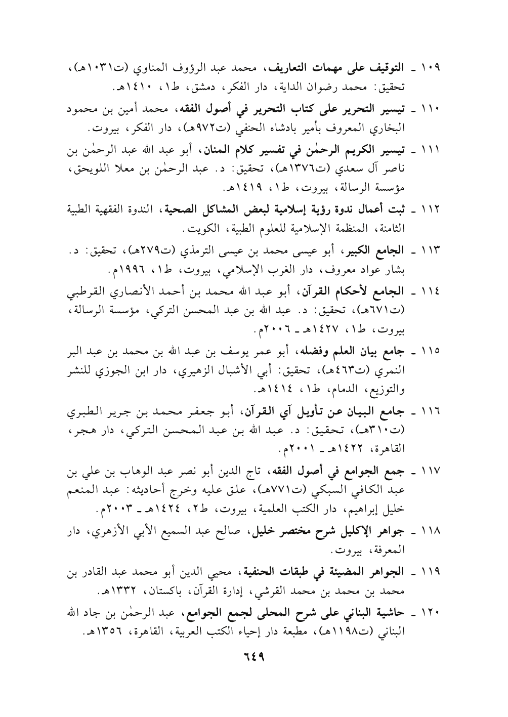 ١٠٩. التوقيف على مهمات التعاريف , محمد عبدالرؤوف المناوي (ت ١٠٣١ هـ) , تحقيق: محمد رضوان الداية , دار الفكر , دمشق, ط ١ , ١٤١٠ هـ.