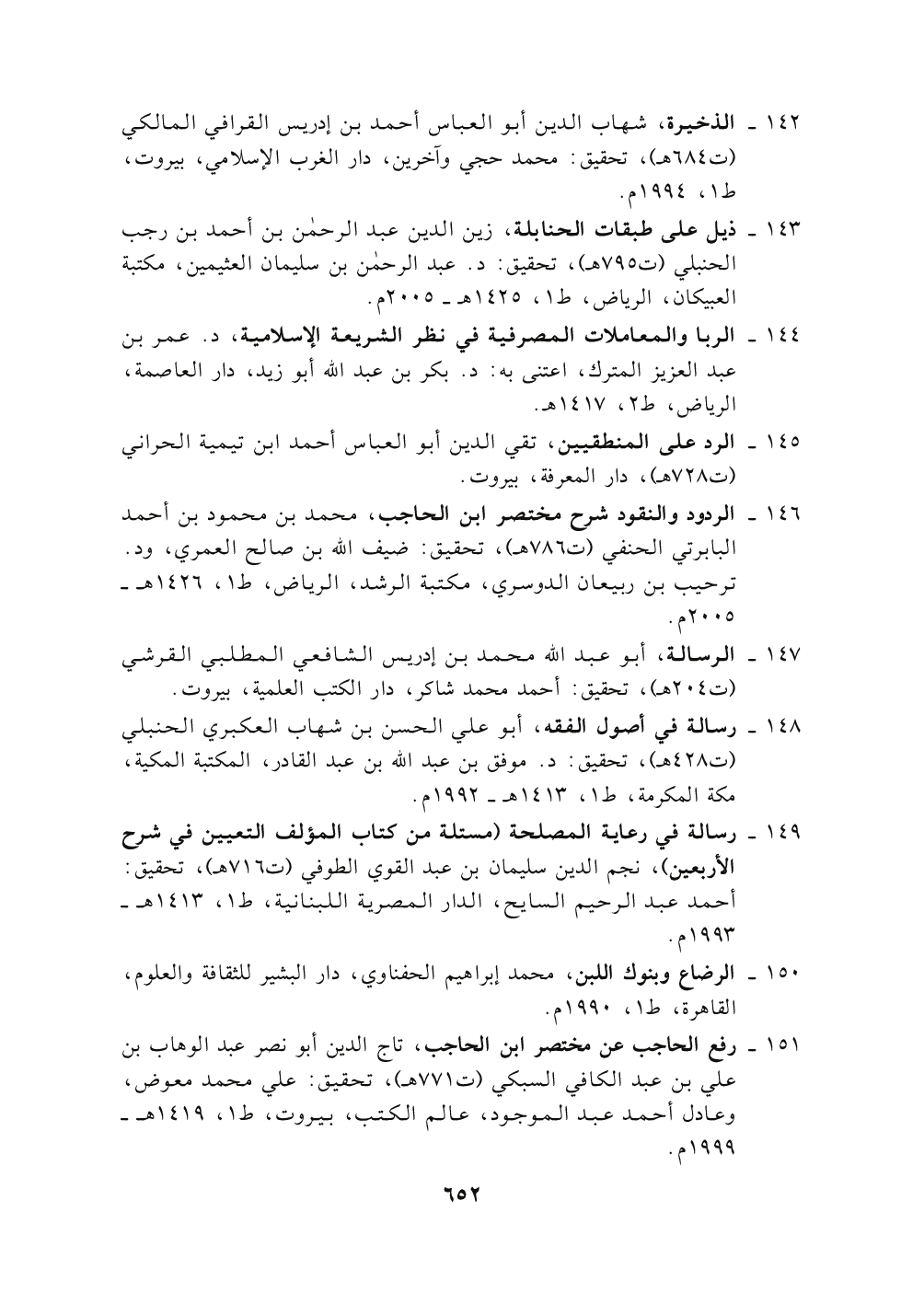 ١٤٢. الذخيرة , شهاب الدين أبو العباس أحمد بن إدريس القرافي المالكي (ت ٦٨٤ هـ) ,تحقيق: محمد حجي وآخرين , دار الغرب الإسلامي , بيروت, ط ١, ١٩٩٤ م.