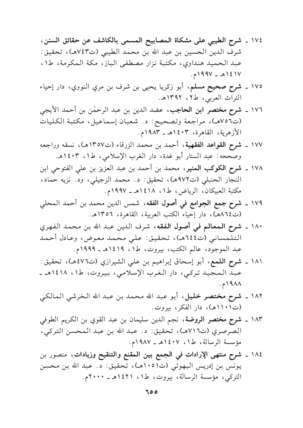 ١٧٤. شرح الطيبي على مشكاة المصابيح المسمى بالكاشف عن حقائق السنن, شرف الدين الحسين بن عبدالله بن محمد الطيبي (ت ٧٤٣ هـ) , تحقيق: عبدالحميد هنداوي, مكتبة نزار مصطفى الباز, مكة المكرمة, ط ١, ١٤١٧ هـ- ١٩٩٧ م.