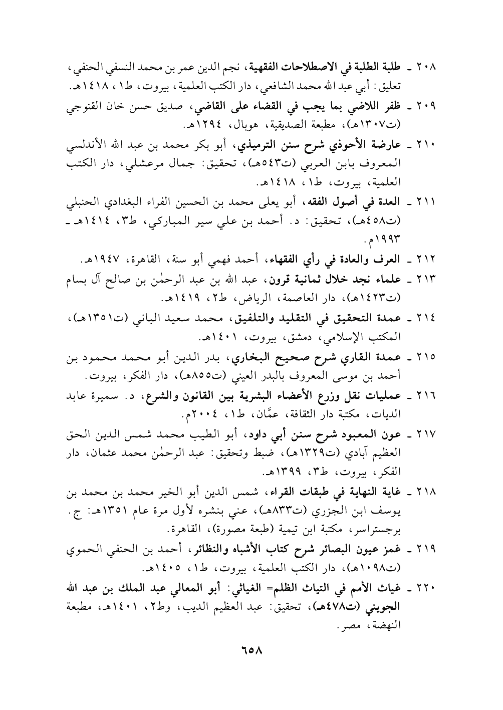 ٢٠٨. طلبة الطلبة في الاصطلاحات الفقهية , نجم الدين عمر بن محمد النسفي الحنفي , تعليق: أبي عبدالله محمد الشافعي , دار الكتب العلمية , بيروت, ط ١, ١٤١٨ هـ.