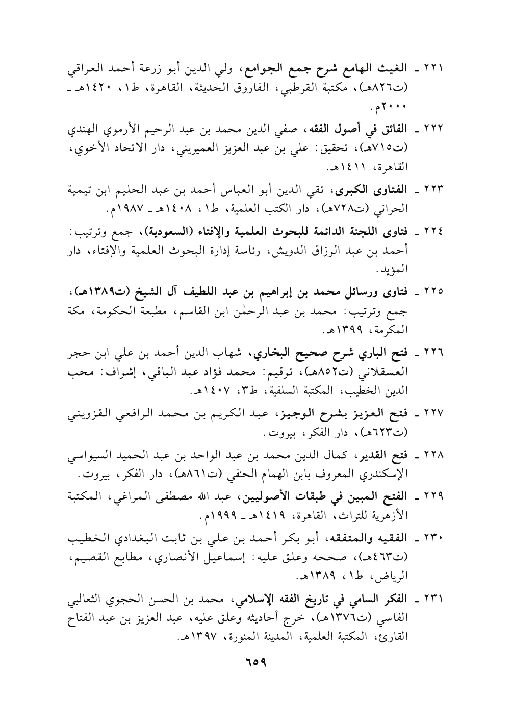 ٢٢١. الغيث الهامع شرح جمع الجوامع ,ولي الدين أبو زرعة أحمد العراقي (ت ٨٢٦ هـ) ,مكتبة القرطبي , الفاروق الحديثة , القاهرة , ط ١, ١٤٢٠ هـ-٢٠٠٠ م.