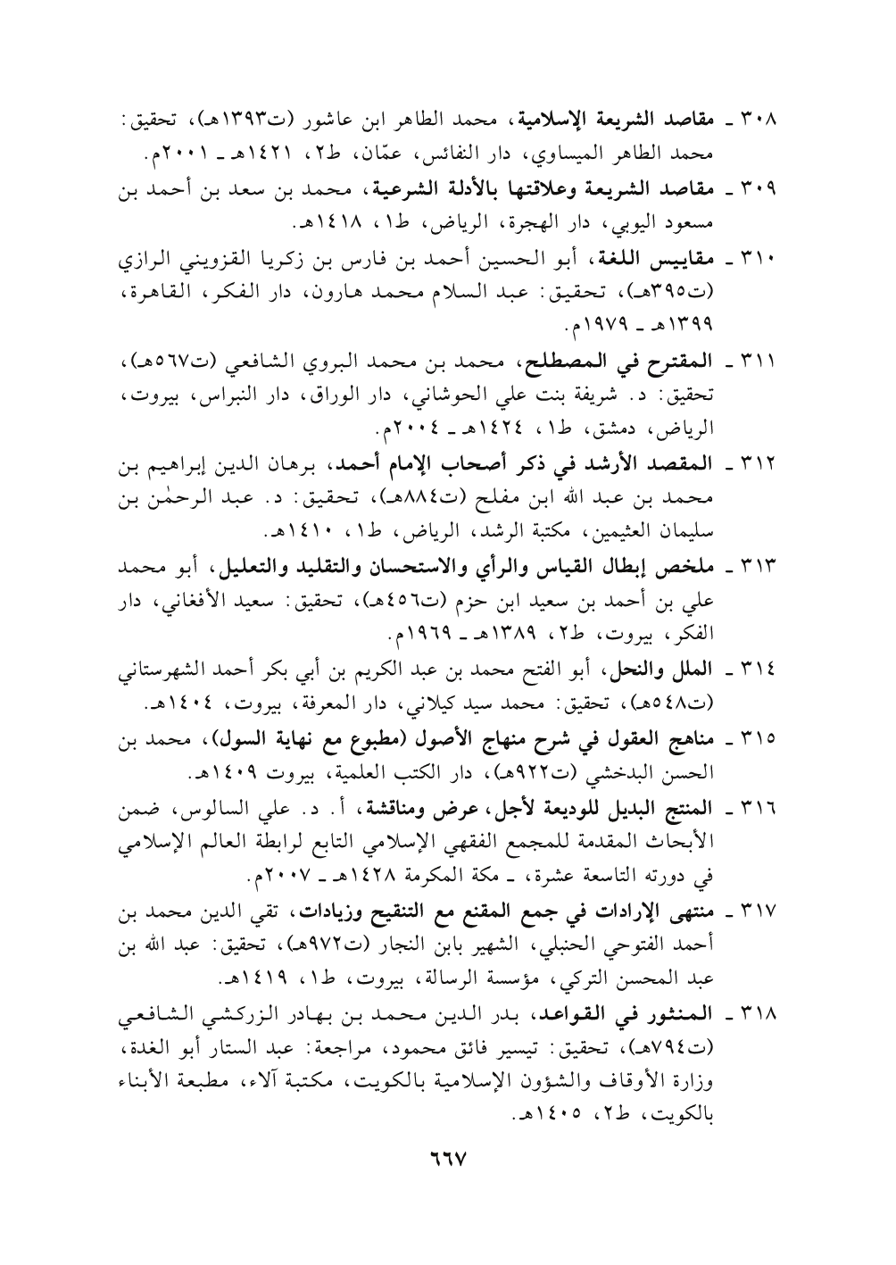 ٣٠٨. مقاصد الشريعة الإسلامية: , محمد الطاهر ابن عاشور (ت ١٣٩٣ هـ) , تحقيق: محمد الطاهر الميساوي, دار النفائس, عمّان, ط ٢ ,١٤٢١ هـ-٢٠٠١ م.