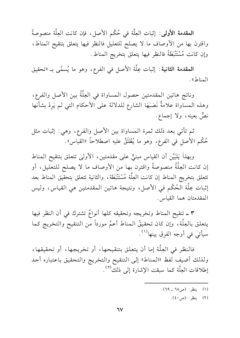 وبهذاَ يَتَبَيِّن أن القياس مبنيٌّ على مقدمتين، الأولى تتعلق بتنقيح المناط إن كانت العِلَّةُ منصوصةً واقترن بها من الأوصاف ما لا يصلح للتعليل، أو تتعلق بتخريج المناط إن كانت العِلَّة مُسْتَنْبَطَة، والثانية تتعلق بتحقيق المناط بعد إثبات عِلَّة الحُكْم في الأصل، ونتيجة هاتين المقدمتين هي القياس، وليس المقدمتان هما القياس.