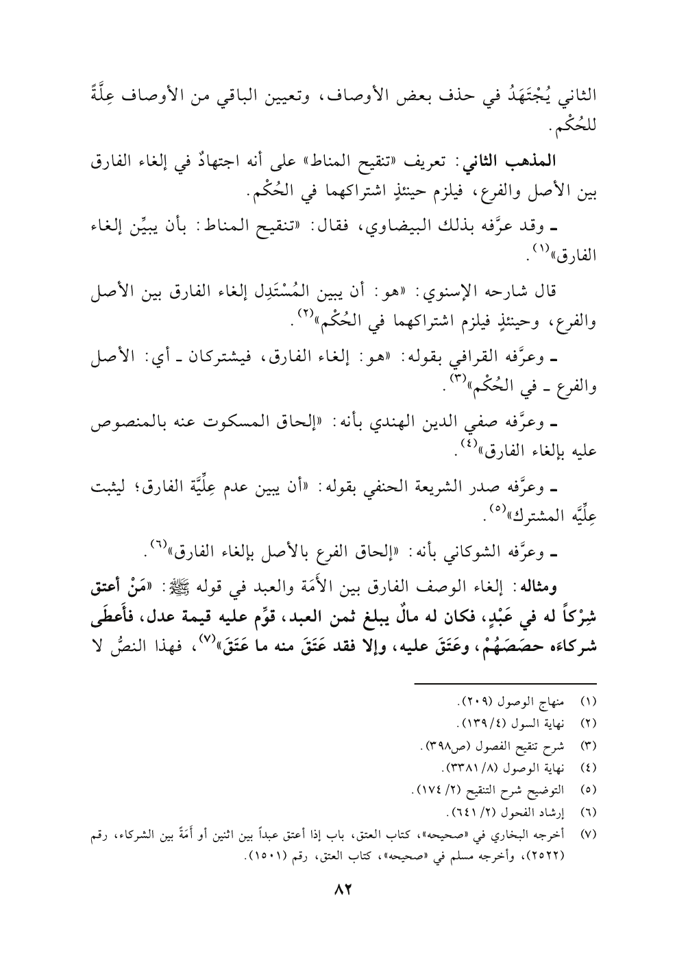ومثاله: إلغاء الوصف الفارق بين الأَمَة والعبد في قوله صلى الله عليه وسلم: "مَنْ أعتق شِرْكاً له في عَبْدٍ، فكان له مالٌ يبلغ ثمن العبد، قوِّم عليه قيمة عدل، فأَعطَى شركاءَه حصَصَهُمْ، وعَتَقَ عليه، وإلا فقد عَتَقَ منه ما عَتَقَ " (٩) فهذا النصُّ لا