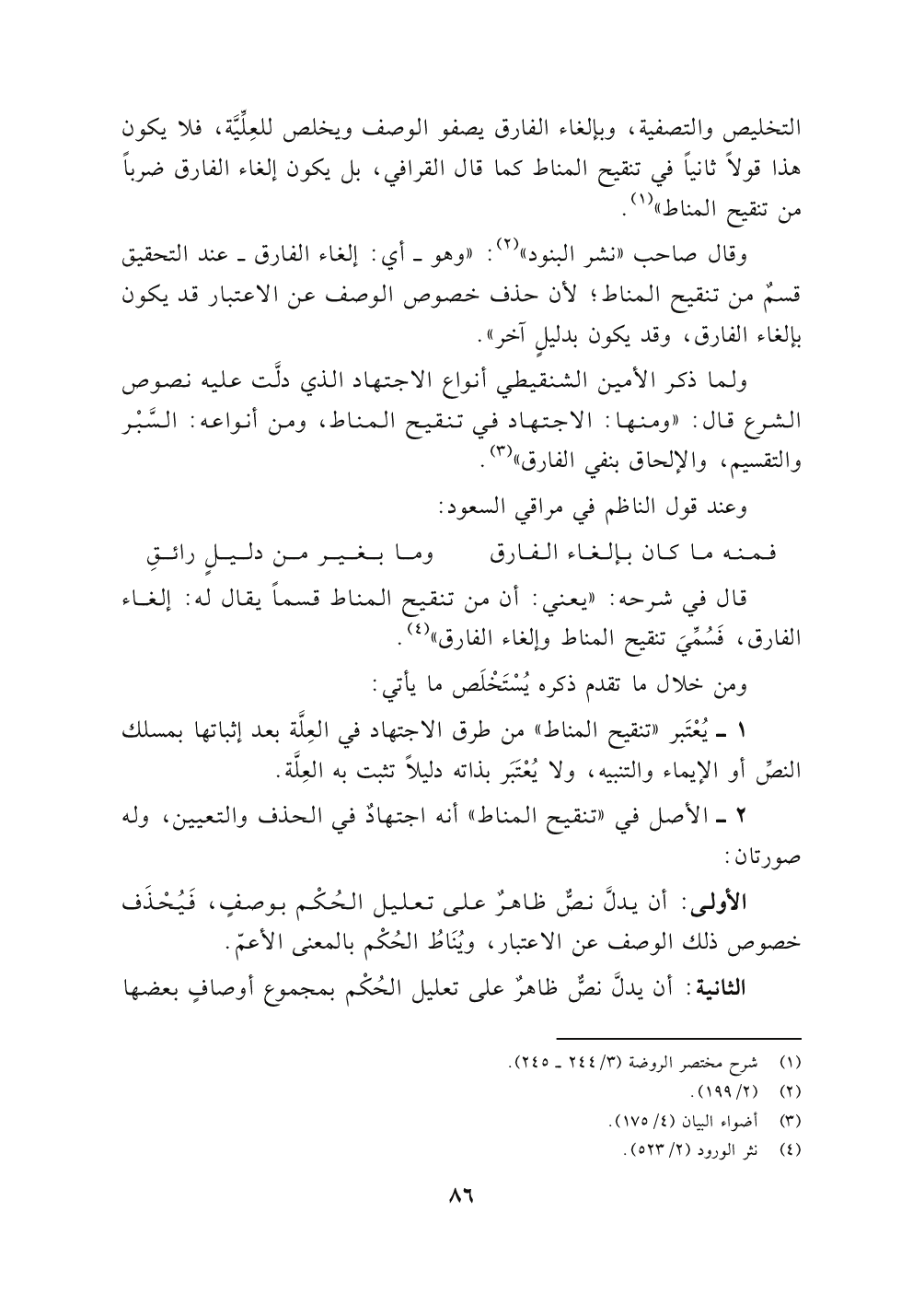 التخليص والتصفية، وبإلغاء الفارق يصفو الوصف ويخلص للعِلِّيَّة، فلا يكون هذا قولاً ثانياً في تنقيح المناط كما قال القرافي، بل يكون إلغاء الفارق ضرباً من تنقيح المناط" (١).