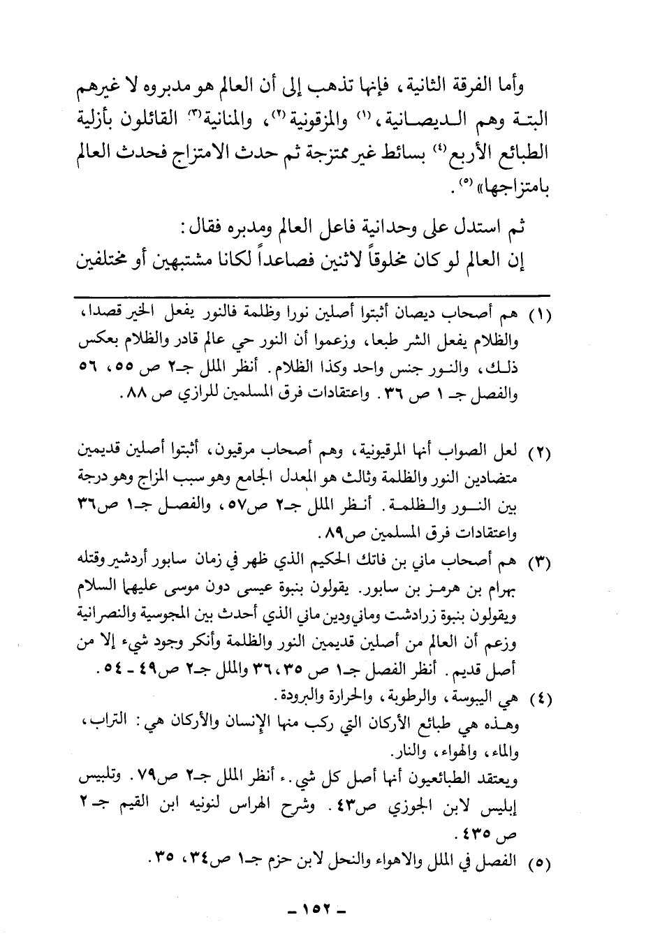 وأما الفرقة الثانية، فإنها تذهب إلى أن العالم هو مدبروه لا غيرهم البتة وهم الديصانية، (¬١) والمزقونية (¬٢)، والمنانية (¬٣) القائلون بأزلية الطبائع الأربع (¬٤) بسائط غير ممتزجة ثم حدث الامتزاج فحدث العالم بامتزاجها" (¬٥).
