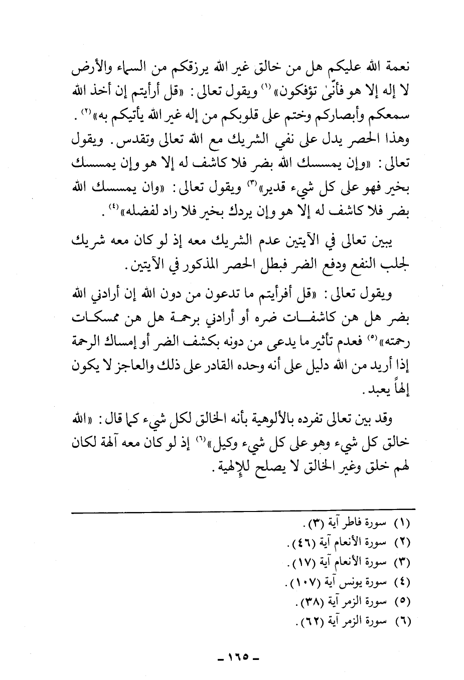 نِعْمَتَ اللَّهِ عَلَيْكُمْ هَلْ مِنْ خَالِقٍ غَيْرُ اللَّهِ يَرْزُقُكُمْ مِنَ السَّمَاءِ وَالْأَرْضِ لَا إِلَهَ إِلَّا هُوَ فَأَنَّى تُؤْفَكُونَ (٣)} (¬١) ويقول تعالى: {قُلْ أَرَأَيْتُمْ إِنْ أَخَذَ اللَّهُ سَمْعَكُمْ وَأَبْصَارَكُمْ وَخَتَمَ عَلَى قُلُوبِكُمْ مَنْ إِلَهٌ غَيْرُ اللَّهِ يَأْتِيكُمْ بِهِ} (¬٢). وهذا الحصر يدل على نفي الشريك مع الله تعالى وتقدس. ويقول تعالى: {وَإِنْ يَمْسَسْكَ اللَّهُ بِضُرٍّ فَلَا كَاشِفَ لَهُ إِلَّا هُوَ وَإِنْ يَمْسَسْكَ بِخَيْرٍ فَهُوَ عَلَى كُلِّ شَيْءٍ قَدِيرٌ} (¬٣) ويقول تعالى: {وَإِنْ يَمْسَسْكَ اللَّهُ بِضُرٍّ فَلَا كَاشِفَ لَهُ إِلَّا هُوَ وَإِنْ يُرِدْكَ بِخَيْرٍ فَلَا رَادَّ لِفَضْلِهِ} (¬٤).