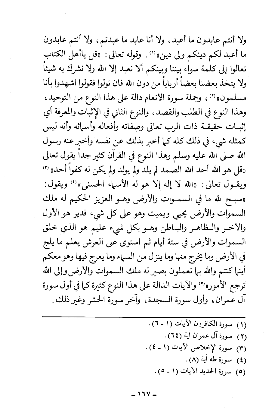وَلَا أَنْتُمْ عَابِدُونَ مَا أَعْبُدُ (٣) وَلَا أَنَا عَابِدٌ مَا عَبَدْتُمْ (٤) وَلَا أَنْتُمْ عَابِدُونَ مَا أَعْبُدُ (٥) لَكُمْ دِينُكُمْ وَلِيَ دِينِ (٦)} (¬١). وقوله تعالى: {قُلْ يَاأَهْلَ الْكِتَابِ تَعَالَوْا إِلَى كَلِمَةٍ سَوَاءٍ بَيْنَنَا وَبَيْنَكُمْ أَلَّا نَعْبُدَ إِلَّا اللَّهَ وَلَا نُشْرِكَ بِهِ شَيْئًا وَلَا يَتَّخِذَ بَعْضُنَا بَعْضًا أَرْبَابًا مِنْ دُونِ اللَّهِ فَإِنْ تَوَلَّوْا فَقُولُوا اشْهَدُوا بِأَنَّا مُسْلِمُونَ} (¬٢)، وجملة سورة الأنعام دالة على هذا النوع من التوحيد، وهذا النوع في الطلب والقصد، والنوع الثاني في الإثبات والمعرفة أي إثبات حقيقة ذات الرب تعالى وصفاته وأفعاله وأسمائه وأنه ليس كمثله شيء في ذلك كله كما أخبر بذلك عن نفسه وأخبر عنه رسول الله صلى الله عليه وسلم وهذا النوع في القران كثير جدًّا يقول تعالى {قُلْ هُوَ اللَّهُ أَحَدٌ (١) اللَّهُ الصَّمَدُ (٢) لَمْ يَلِدْ وَلَمْ يُولَدْ (٣) وَلَمْ يَكُنْ لَهُ كُفُوًا أَحَدٌ (٤)} (¬٣) ويقول تعالى: {اللَّهُ لَا إِلَهَ إِلَّا هُوَ لَهُ الْأَسْمَاءُ الْحُسْنَى} (¬٤) ويقول: {سَبَّحَ لِلَّهِ مَا فِي السَّمَاوَاتِ وَالْأَرْضِ وَهُوَ الْعَزِيزُ الْحَكِيمُ (١) لَهُ مُلْكُ السَّمَاوَاتِ وَالْأَرْضِ يُحْيِي وَيُمِيتُ وَهُوَ عَلَى كُلِّ شَيْءٍ قَدِيرٌ (٢) هُوَ الْأَوَّلُ وَالْآخِرُ وَالظَّاهِرُ وَالْبَاطِنُ وَهُوَ بِكُلِّ شَيْءٍ عَلِيمٌ (٣) هُوَ الَّذِي خَلَقَ السَّمَاوَاتِ وَالْأَرْضَ فِي سِتَّةِ أَيَّامٍ ثُمَّ اسْتَوَى عَلَى الْعَرْشِ يَعْلَمُ مَا يَلِجُ فِي الْأَرْضِ وَمَا يَخْرُجُ مِنْهَا وَمَا يَنْزِلُ مِنَ السَّمَاءِ وَمَا يَعْرُجُ فِيهَا وَهُوَ مَعَكُمْ أَيْنَ مَا كُنْتُمْ وَاللَّهُ بِمَا تَعْمَلُونَ بَصِيرٌ (٤) لَهُ مُلْكُ السَّمَاوَاتِ وَالْأَرْضِ وَإِلَى اللَّهِ تُرْجَعُ الْأُمُورُ (¬٥)} والآيات الدالة على هذا النوع كثيرة كما في أول سورة آل عمران، وأول سورة السجدة، وآخر سورة الحشر وغير ذلك.