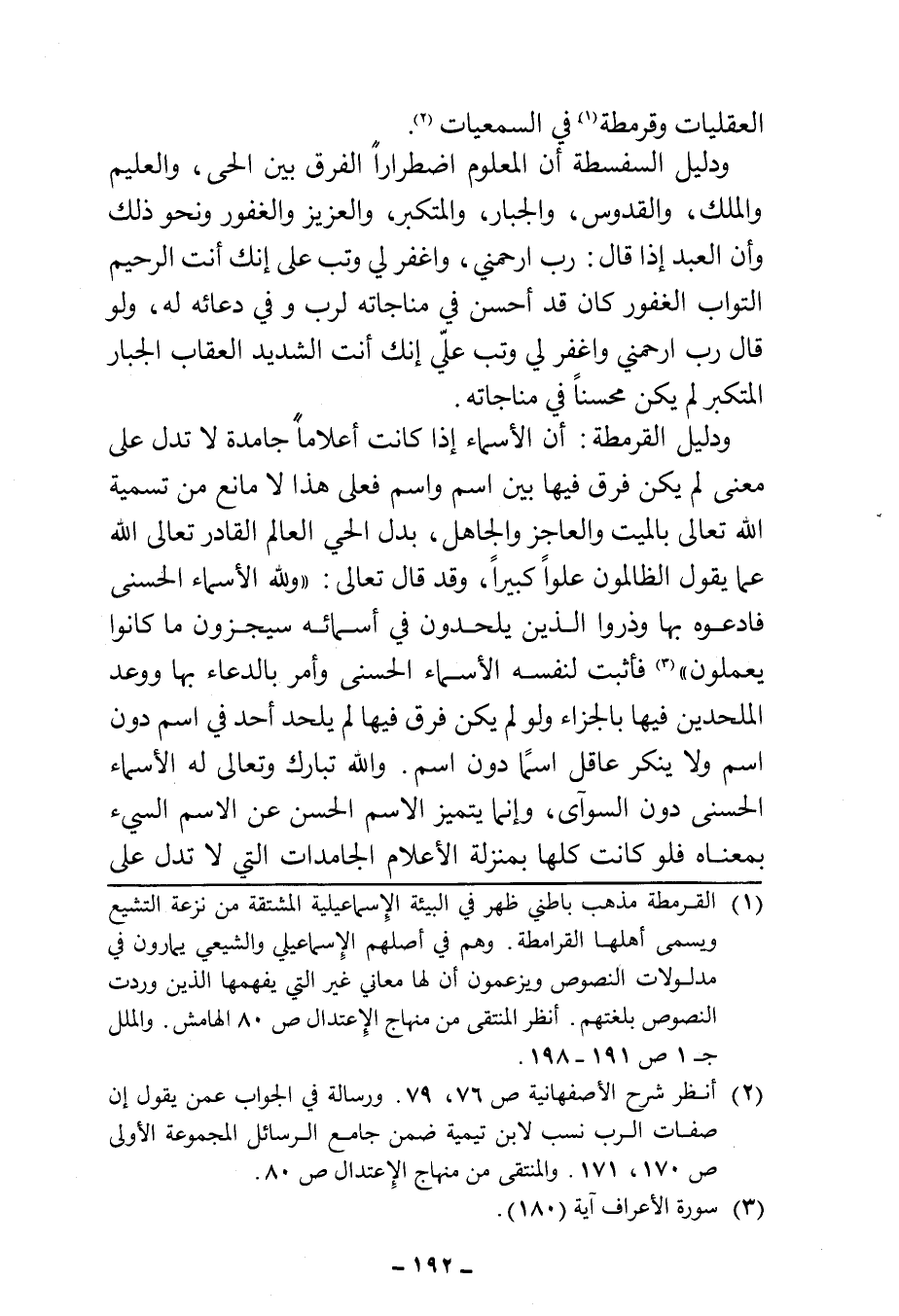 ودليل القرمطة: أن الأسماء إذا كانت أعلامًا جامدة لا تدل على معنى لم يكن فرق فيها بين اسم واسم فعلى هذا لا مانع من تسمية الله تعالى بالميت والعاجز والجاهل، بدل الحي العالم القادر تعالى الله عما يقول الظالمون علوًا كبيرًا، وقد قال تعالى: {وَلِلَّهِ الْأَسْمَاءُ الْحُسْنَى فَادْعُوهُ بِهَا وَذَرُوا الَّذِينَ يُلْحِدُونَ فِي أَسْمَائِهِ سَيُجْزَوْنَ مَا كَانُوا يَعْمَلُونَ} (¬٣) فأثبت لنفسه الأسماء الحسنى وأمر بالدعاء بها ووعد الملحدين فيها بالجزاء ولو لم يكن فروا فيها لم يلحد أحد في اسم دون اسم ولا ينكر عاقل اسما دون اسم. والله تبارك وتعالى له الأسماء الحسنى دون السوآى، وإنما يتميز الاسم الحسن عن الاسم السيء بمعناه فلو كانت كلها بمنزلة الأعلام الجامدات التي لا تدل على