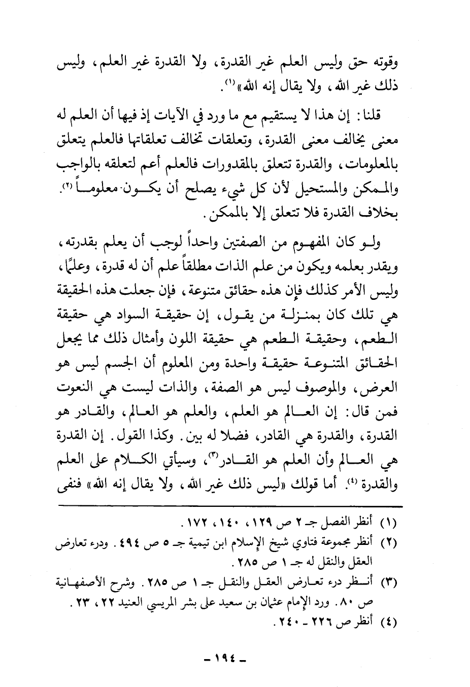 قلنا: إن هذا لا يستقيم مع ما ورد في الآيات إذ فيها أن العلم له معنى يخالف معنى القدرة، وتعلقات تخالف تعلقاتها فالعلم يتعلق بالمعلومات، والقدرة تتعلق بالمقدورات فالعلم أعم لتعلقه بالواجب والممكن والمستحيل لأن كل شيء يصلح أن يكون معلومًا (¬٢). بخلاف القدرة فلا تتعلق إلا بالممكن.