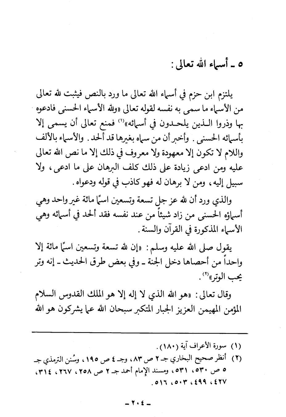 يلتزم ابن حزم في أسماء الله تعالى ما ورد بالنص فيثبت لله تعالى من الأسماء ما سمى به نفسه لقوله تعالى {وَلِلَّهِ الْأَسْمَاءُ الْحُسْنَى فَادْعُوهُ بِهَا وَذَرُوا الَّذِينَ يُلْحِدُونَ فِي أَسْمَائِهِ} (¬١) فمنع تعالى أن يسمى إلا بأسمائه الحسنى. وأخبر أن من سماه بغيرها قد ألحد. والأسماء بالألف واللام لا تكون إلا معهودة ولا معروف في ذلك إلا ما نص الله تعالى عليه ومن ادعى زيادة على ذلك كلف البرهان على ما ادعى، ولا سبيل إليه، ومن لا برهان له فهو كاذب في قوله ودعواه.