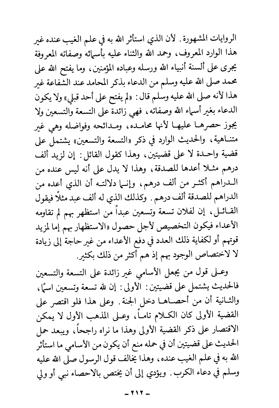 الروايات المشهورة. لأن الذي استأثر الله به في علم الغيب عنده غير هذا الوارد المعروف، وحمد الله والثثاء عليه بأسمائه وصفاته المعروفة يجرى على ألسنة أنبياء الله ورسله وعباده المؤمنين، وما يفتح الله على محمد صلى الله عليه وسلم من الدعاء بذكر المحامد عند الشفاعة غير هذا لأنه صلى الله عليه وسلم قال: "لم يفتح على أحد قبلي" ولا يكون الدعاء بغير أسماء الله وصفاته، فهي زائدة على التسعة والتسعين ولا يجوز حصرها عليها لأنها محامده، ومدائحه وفواضله وهي غير متناهية، والحديث الوارد في ذكر "التسعة والتسعين" يشتمل على قضية واحدة لا على قضيتين، وهذا كقول القائل: إن لزيد ألف درهم مثلا أعدها للصدقة، وهذا لا يدل على أنه ليس عنده من الدراهم أكثر من ألف درهم، وإنما دلالته أن الذي أعده من الدراهم للصدقة ألف درهم. وكذلك الذي له ألف عبد مثلًا فيقول القائل، إن لفلان تسعة وتسعين عبدا من استظهر بهم لم تقاومه الأعداء فيكون التخصيص لأجل حصول "الاستظهار بهم إما لمزيد قوتهم أو لكفاية ذلك العدد في دفع الأعداء من غير حاجة إلى زيادة لا لاختصاص الوجود بهم إذ هم أكثر من ذلك بكثير.