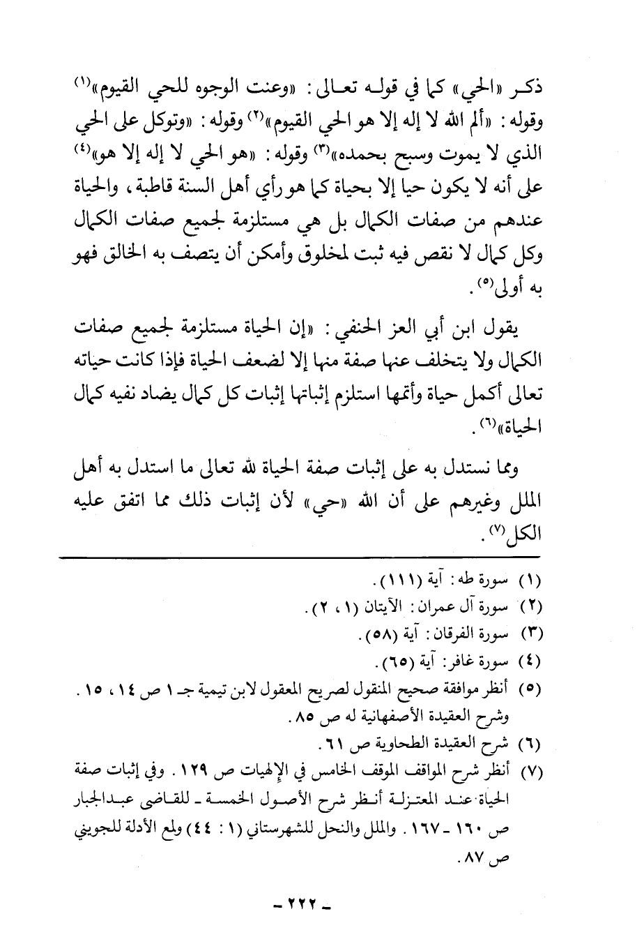 ذكر "الحي" كما في قوله تعالى: " {وَعَنَتِ الْوُجُوهُ لِلْحَيِّ الْقَيُّومِ وَقَدْ خَابَ مَنْ حَمَلَ ظُلْمًا (١١١)} " (¬١) وقوله: " {الم (١) اللَّهُ لَا إِلَهَ إِلَّا هُوَ الْحَيُّ الْقَيُّومُ (٢)} " (¬٢) وقوله: " {وَتَوَكَّلْ عَلَى الْحَيِّ الَّذِي لَا يَمُوتُ وَسَبِّحْ بِحَمْدِهِ} " (¬٣) وقوله: " {هُوَ الْحَيُّ لَا إِلَهَ إِلَّا هُوَ} " (¬٤) على أنه لا يكون حيا إلا بحياة كما هو رأي أهل السنة قاطبة، والحياة عندهم من صفات الكمال بل هي مستلزمة لجميع صفات الكمال وكل كمال لا نقص فيه ثبت لمخلوق وأمكن أن يتصف به الخالق فهو به أولى (¬٥).