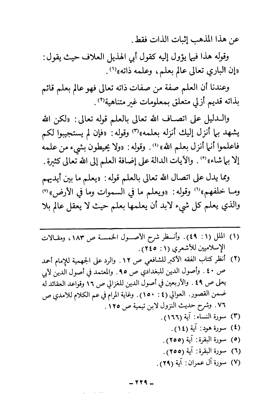 والدليل على اتصاف الله تعالى بالعلم قوله تعالى: " {لَكِنِ اللَّهُ يَشْهَدُ بِمَا أَنْزَلَ إِلَيْكَ أَنْزَلَهُ بِعِلْمِهِ} " (¬٣) وقوله: " {فَإِلَّمْ يَسْتَجِيبُوا لَكُمْ فَاعْلَمُوا أَنَّمَا أُنْزِلَ بِعِلْمِ اللَّهِ} (¬٤). وقوله: " {وَلَا يُحِيطُونَ بِشَيْءٍ مِنْ عِلْمِهِ إِلَّا بِمَا شَاءَ} " (¬٥). والآيات الدالة على إضافة العلم إلى الله تعالى كثيرة.