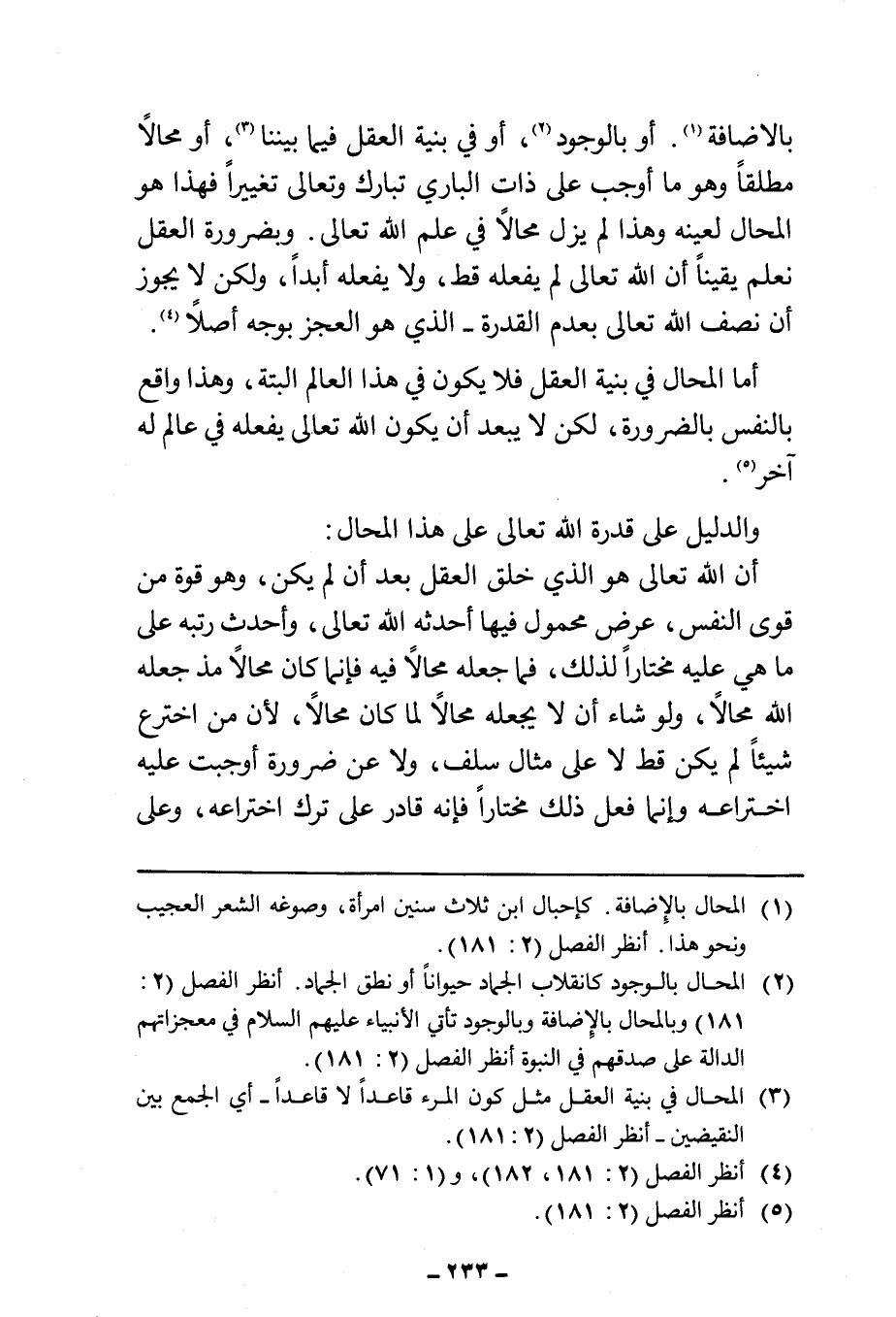 (¬٢) المحال بالوجود كانقلاب الجماد حيوانًا أو نطق الجماد. انظر الفصل (٢: ١٨١) وبالمحال بالإضافة وبالوجود تأتي الأنبياء عليهم السلام في معجزاتهم الدالة على صدقهم في النبوة انظر الفصل (٢: ١٨١).