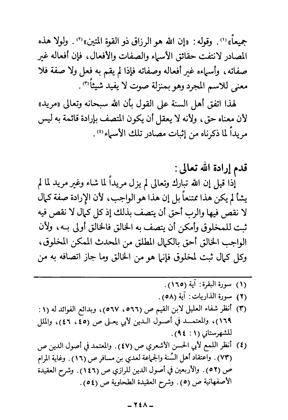(¬٤) انظر اللمع لأبي الحسن الأشعري ص (٤٧). والمعتمد في أصول الدين ص (٧٣). واعتقاد أهل السُنة والجماعة لعدي بن مسافر ص (١٦). وغاية المرام ص (٥٢). والأربعين في أصول الدين للرازي ص (١٤٦). وشرح العقيدة الأصفهانية ص (٥). وشرح العقيدة الطحاوية ص (٥٤).