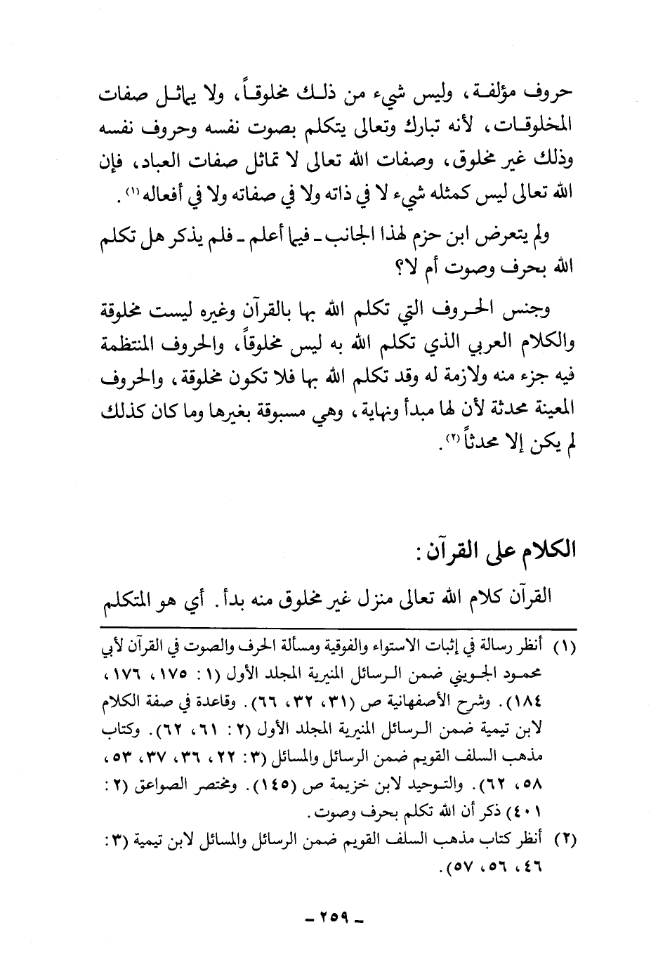 (¬١) انظر رسالة في إثبات الاستواء والفوقية ومسألة الحرف والصوت في القرآن لأبي محمود الجويني ضمن الرسائل المنيرية المجلد الأول (١: ١٧٥، ١٧٦، ١٨٤). وشرح الأصفهانية ص (٣١، ٣٢، ٦٦). وقاعدة في صفة الكلام لابن تيمية ضمن الرسائل المنيرية المجلد الأول (٢: ٦١، ٦٢). وكتاب مذهب السلف القويم ضمن الرسائل والمسائل (٣: ٢٢، ٣٦، ٣٧، ٥٣، ٥٨، ٦٢). والتوحيد لابن خزيمة ص (١٤٥). ومختصر الصواعق (٢: ٤٠١) ذكر أن الله تكلم بحرف وصوت.