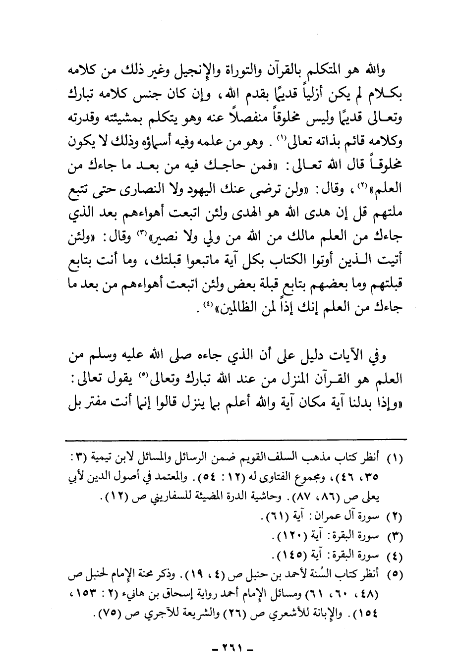(¬٥) انظر كتاب السنة لأحمد بن حنبل ص (٤، ١٩). وذكر محنة الإمام لحنبل ص (٤٨، ٦٠، ٦١) ومسائل الإمام أحمد رواية إسحاق بن هانيء (٢: ١٥٣، ١٥٤). والإبانة للأشعري ص (٢٦) والشريعة للآجري ص (٧٥).