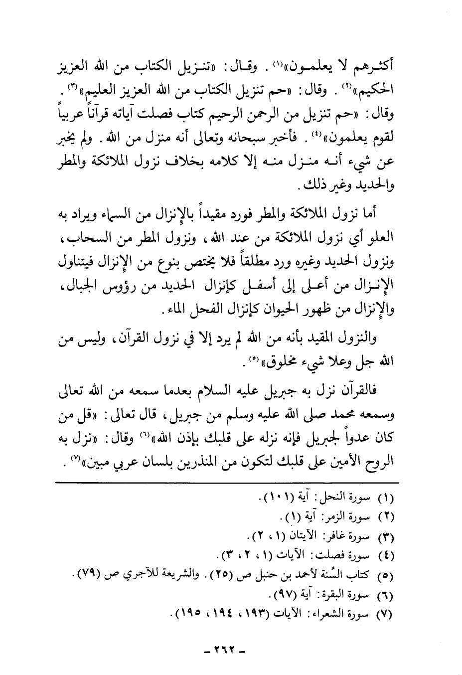 أَكْثَرُهُمْ لَا يَعْلَمُونَ} (¬١). {تَنْزِيلُ الْكِتَابِ مِنَ اللَّهِ الْعَزِيزِ الْحَكِيمِ} (¬٢). وقال: {حم (١) تَنْزِيلُ الْكِتَابِ مِنَ اللَّهِ الْعَزِيزِ الْعَلِيمِ} (¬٣). وقال: " {حم (١) تَنْزِيلٌ مِنَ الرَّحْمَنِ الرَّحِيمِ (٢) كِتَابٌ فُصِّلَتْ آيَاتُهُ قُرْآنًا عَرَبِيًّا لِقَوْمٍ يَعْلَمُونَ} (¬٤). فأخبر سبحانه وتعالى أنه منزل من الله. ولم يخبر عن شيء أنه منزل منه إلا كلامه بخلاف نزول الملائكة والمطر والحديد وغير ذلك.