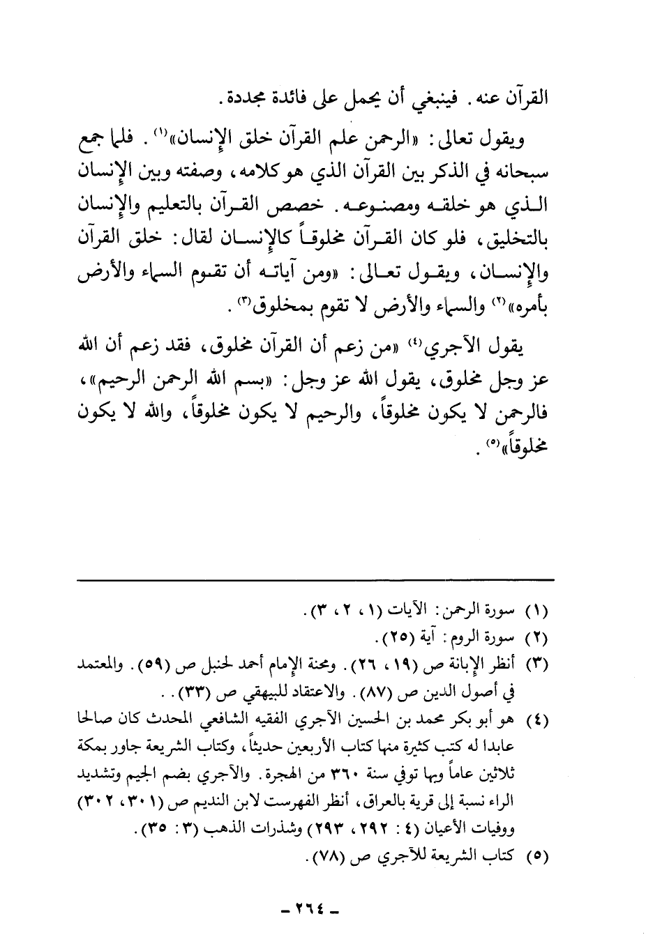 يقول الآجري (¬٤) "من زعم أن القرآن مخلوق، فقد زعم أن الله عز وجل مخلوق، ، يقول الله عز وجل: "بسم الله الرحمن الرحيم"، فالرحمن لا يكون مخلوقًا، والرحيم لا يكون مخلوقًا، والله لا يكون مخلوقًا" (¬٥).